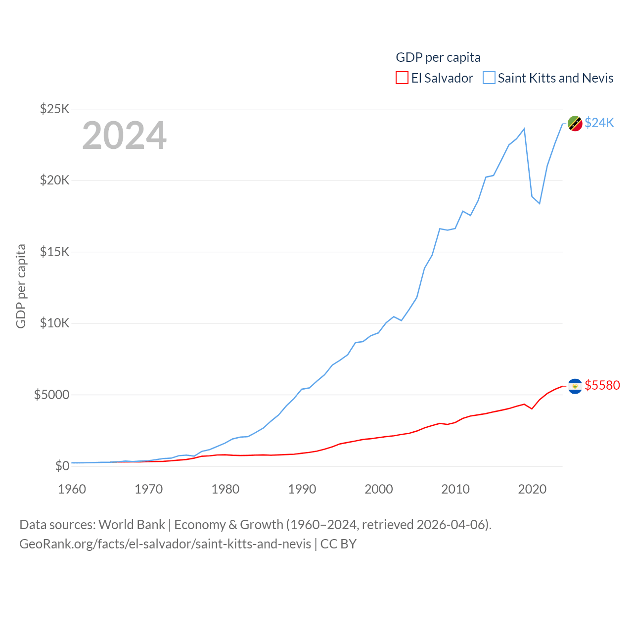 By GDP, El Salvador ranks 105/197 ($35.4B) and Saint Kitts and Nevis ranks 187/197 ($1.12B). By GDP per capita, El Salvador ranks 116/197 ($5,580), while Saint Kitts and Nevis ranks 51/197 ($23,961).