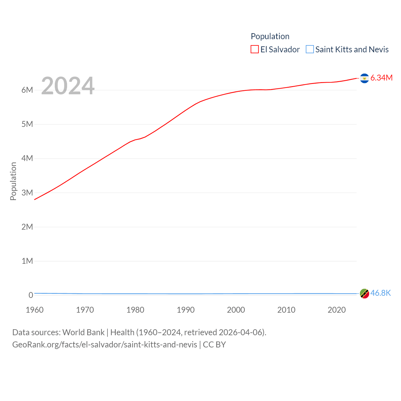 El Salvador has a population of 6.34M (ranked 111/197), compared with 46.8K in Saint Kitts and Nevis (ranked 189/197). El Salvador's land area is 8,000 sq mi versus 100.4 sq mi for Saint Kitts and Nevis (ranked 150th vs. 189th).