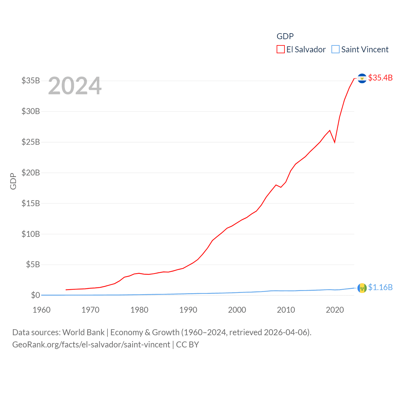 By GDP, El Salvador ranks 105/197 ($35.4B) and Saint Vincent ranks 186/197 ($1.16B). By GDP per capita, El Salvador ranks 116/197 ($5,580), while Saint Vincent ranks 81/197 ($11,501).