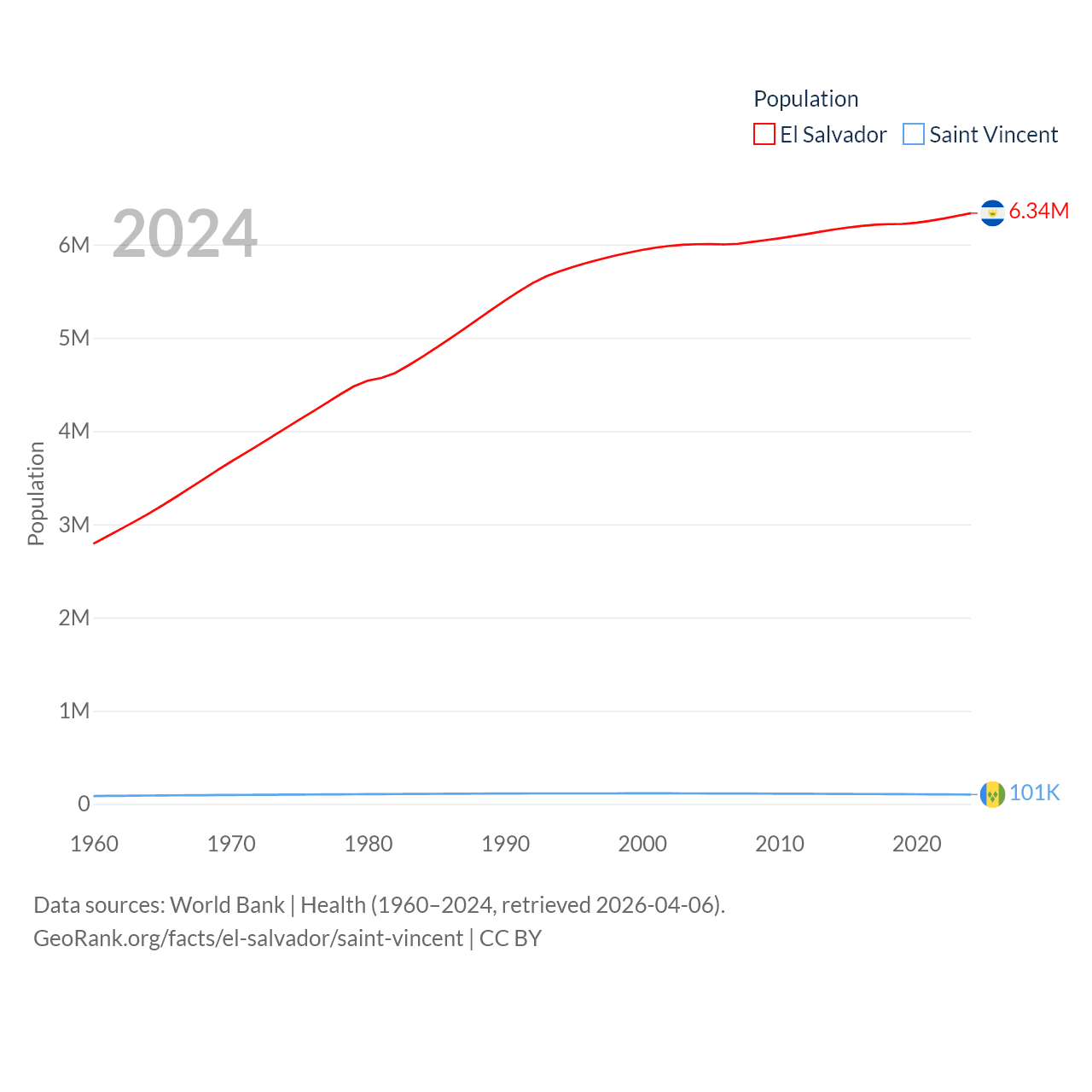 El Salvador has a population of 6.34M (ranked 111/197), compared with 101K in Saint Vincent (ranked 184/197). El Salvador's land area is 8,000 sq mi versus 150.6 sq mi for Saint Vincent (ranked 150th vs. 185th).
