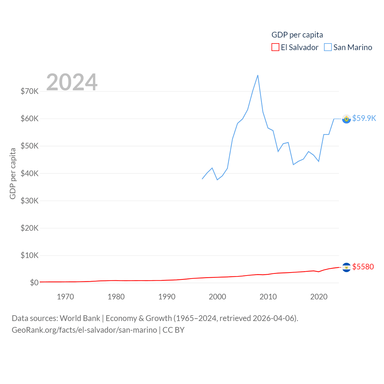 By GDP, El Salvador ranks 105/197 ($35.4B) and San Marino ranks 180/197 ($2.03B). By GDP per capita, El Salvador ranks 116/197 ($5,580), while San Marino ranks 15/197 ($59,880).