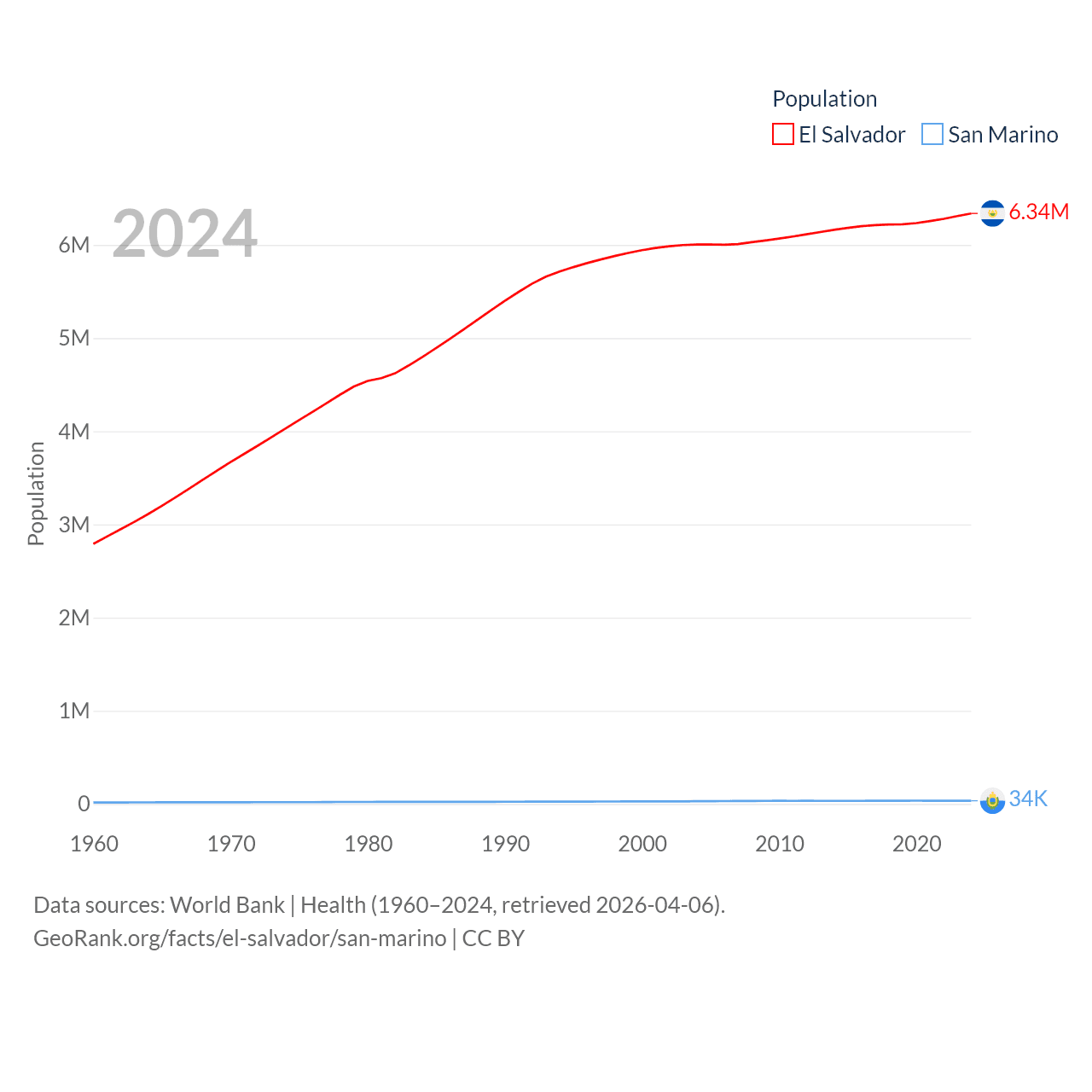 El Salvador has a population of 6.34M (ranked 111/197), compared with 34K in San Marino (ranked 193/197). El Salvador's land area is 8,000 sq mi versus 23.2 sq mi for San Marino (ranked 150th vs. 193rd).