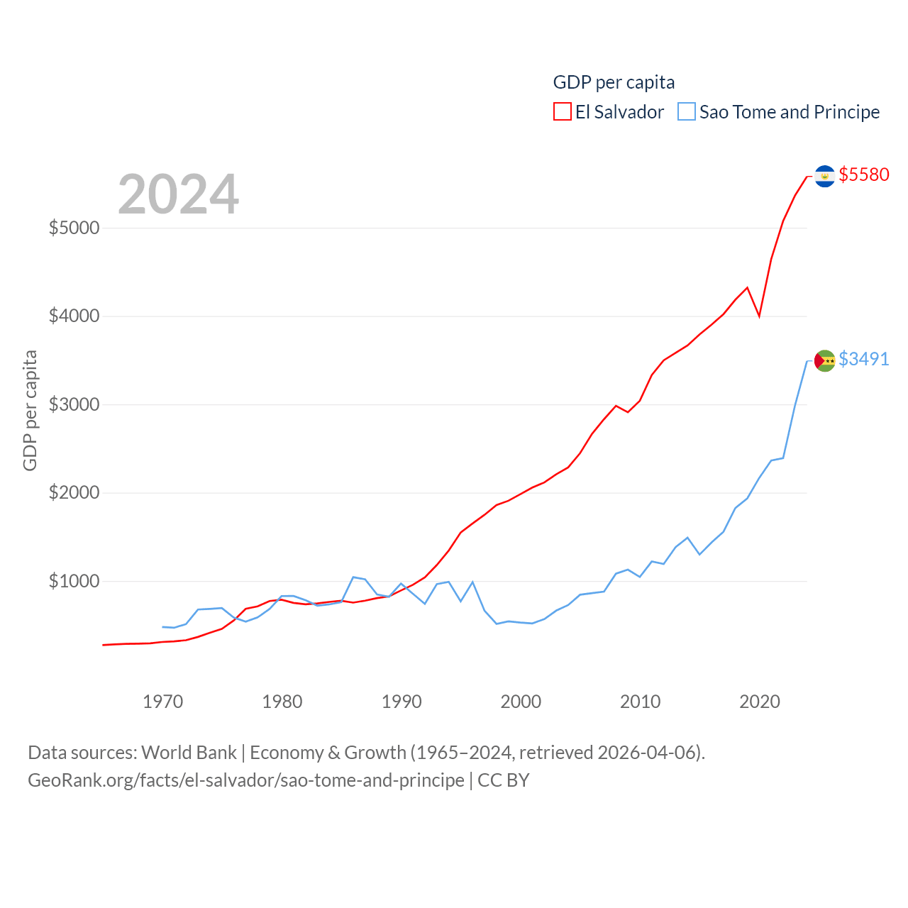 By GDP, El Salvador ranks 105/197 ($35.4B) and Sao Tome and Principe ranks 189/197 ($822M). By GDP per capita, El Salvador ranks 116/197 ($5,580), while Sao Tome and Principe ranks 134/197 ($3,491).