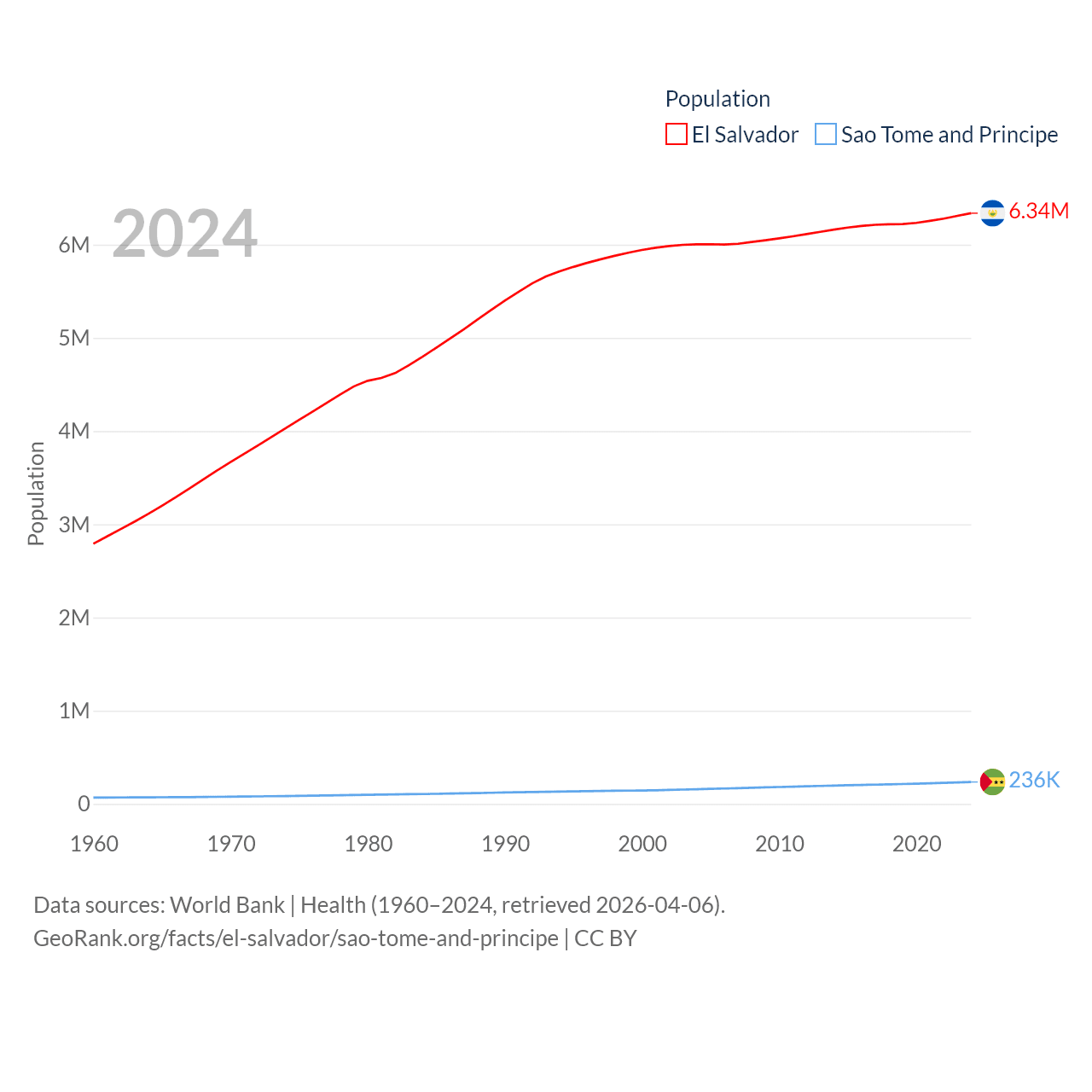 El Salvador has a population of 6.34M (ranked 111/197), compared with 236K in Sao Tome and Principe (ranked 176/197). El Salvador's land area is 8,000 sq mi versus 371 sq mi for Sao Tome and Principe (ranked 150th vs. 172nd).