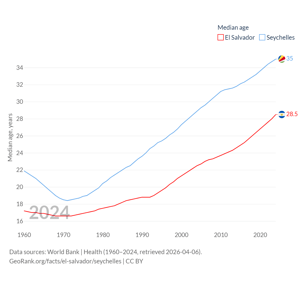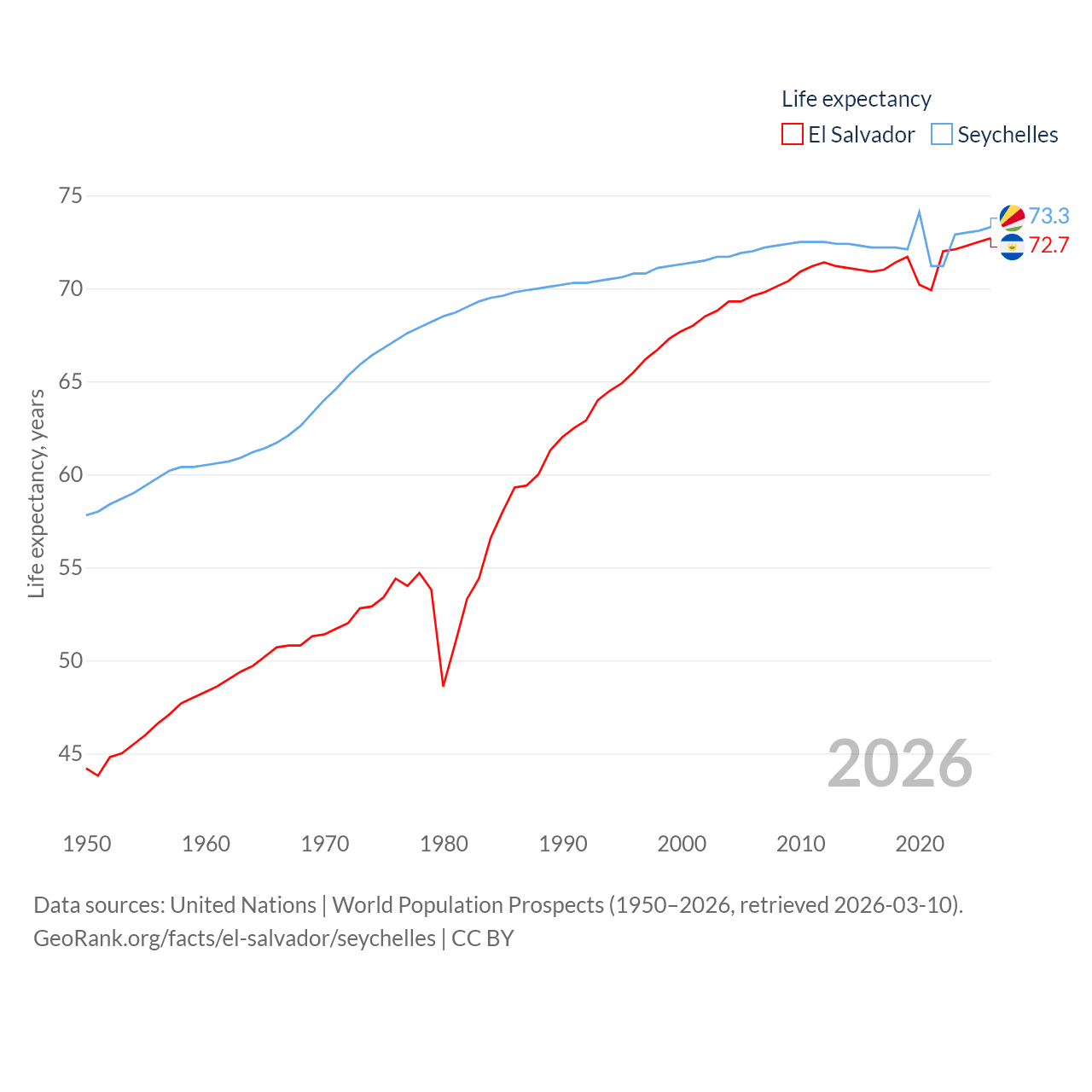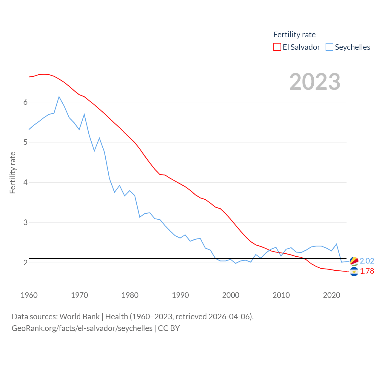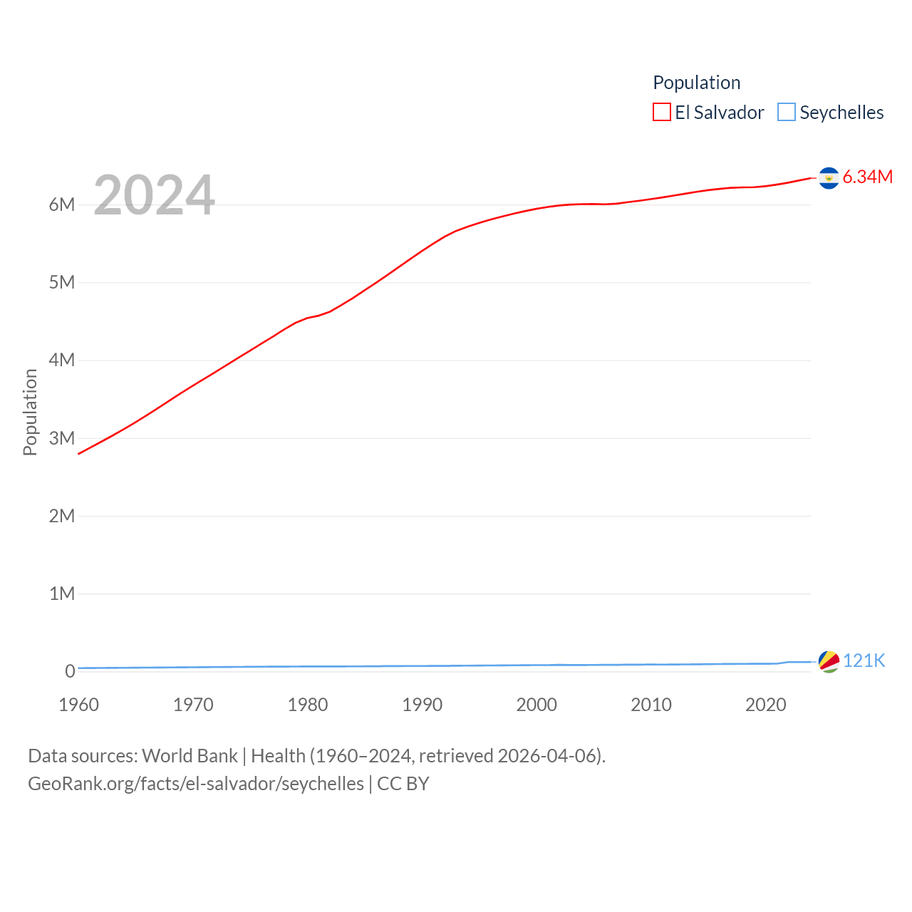 El Salvador has a population of 6.34M (ranked 111/197), compared with 121K in The Seychelles (ranked 181/197). El Salvador's land area is 8,000 sq mi versus 177.6 sq mi for The Seychelles (ranked 150th vs. 181st).