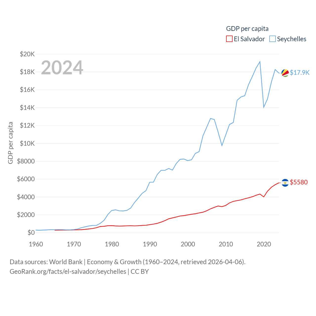 By GDP, El Salvador ranks 105/197 ($35.4B) and The Seychelles ranks 178/197 ($2.17B). By GDP per capita, El Salvador ranks 116/197 ($5,580), while The Seychelles ranks 63/197 ($17,859).