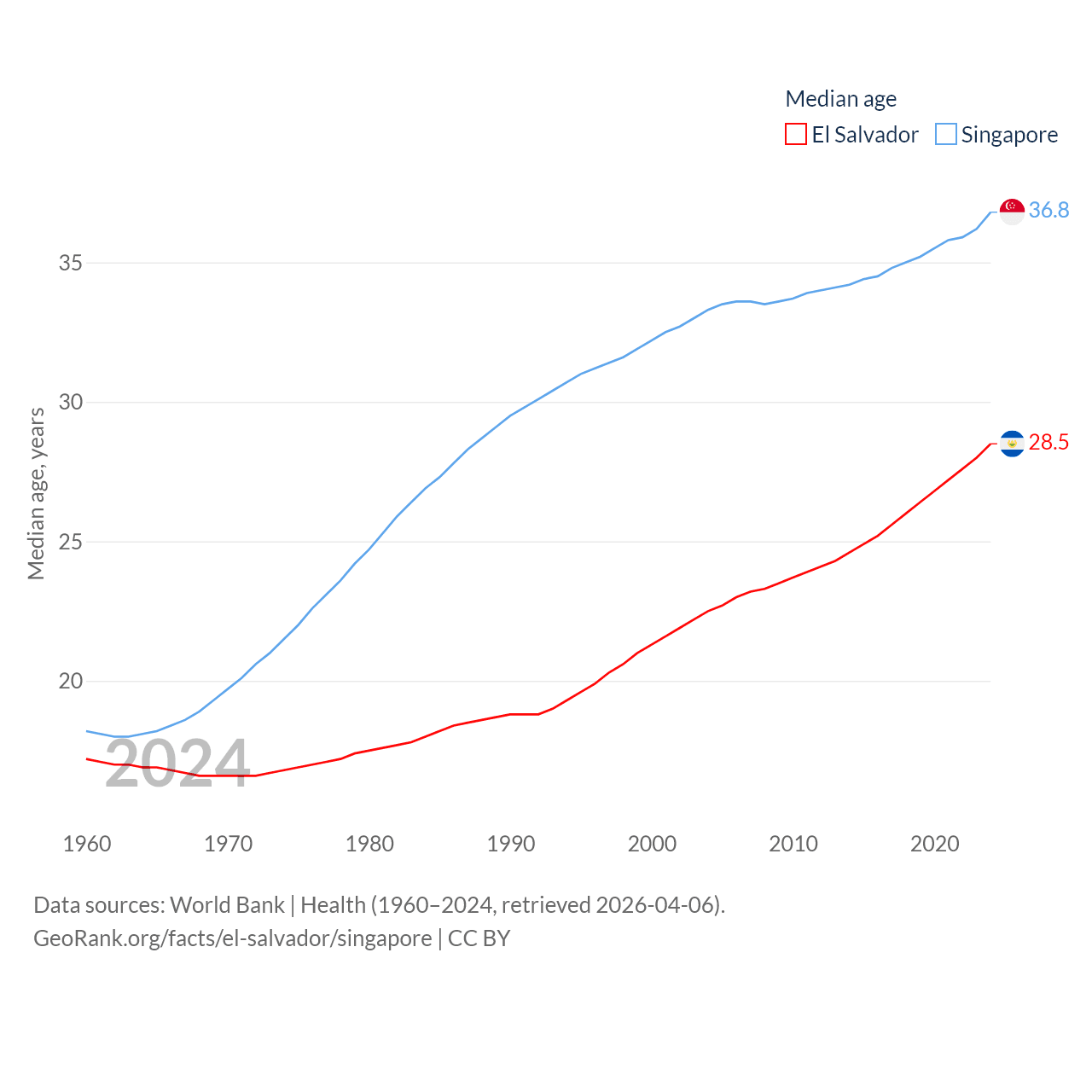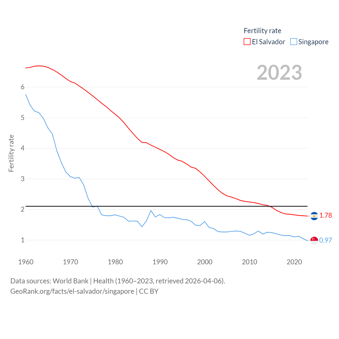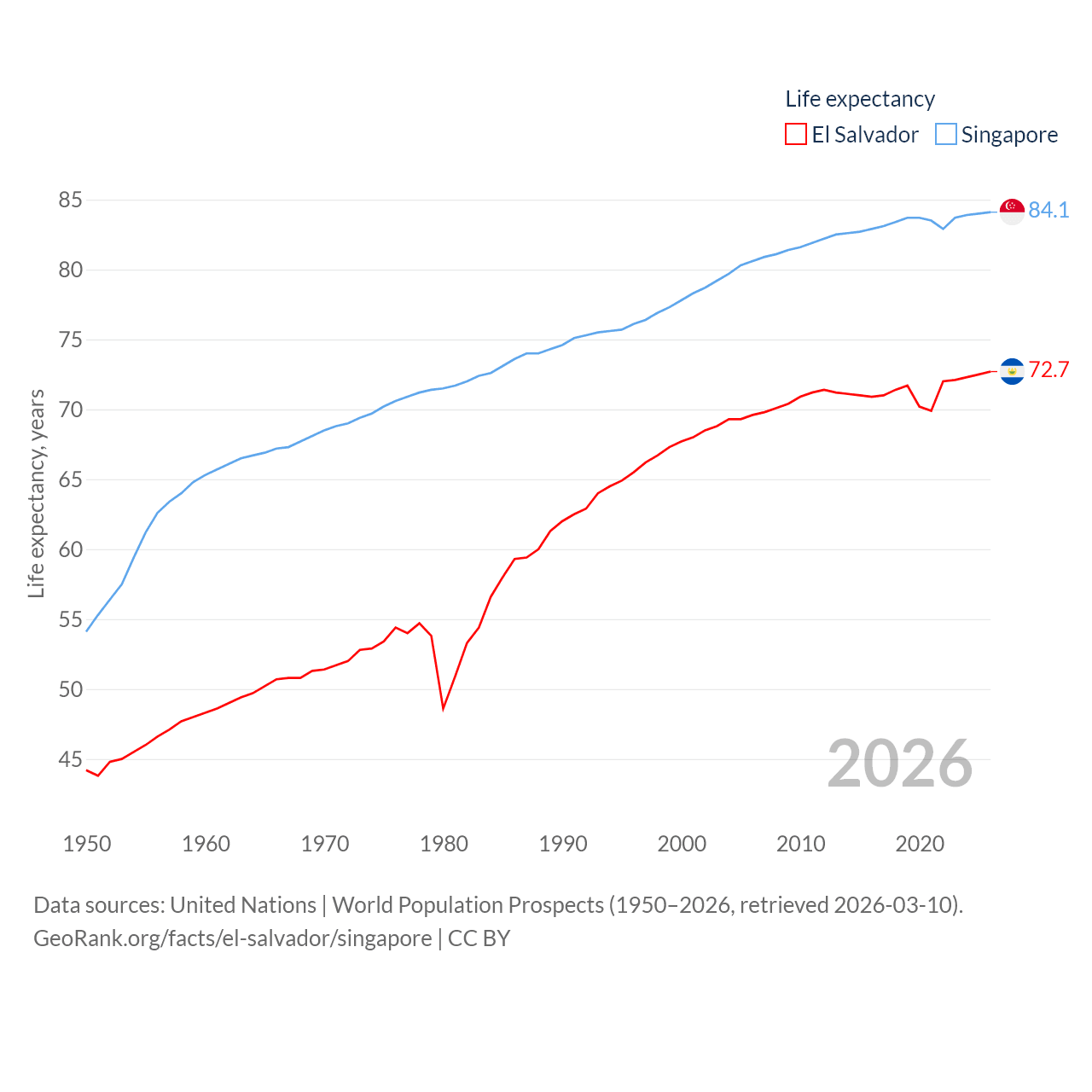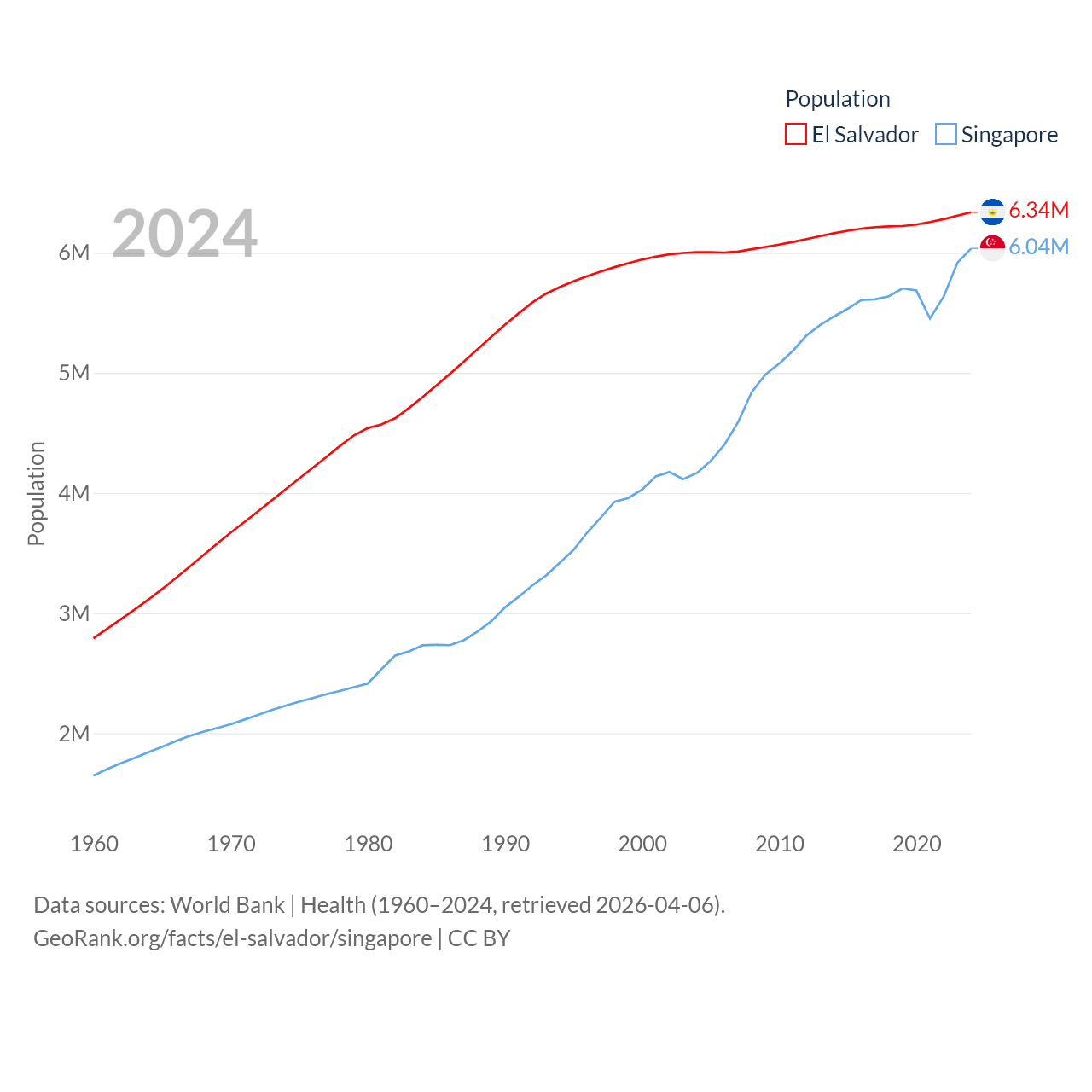 El Salvador has a population of 6.34M (ranked 111/197), compared with 6.04M in Singapore (ranked 113/197). El Salvador's land area is 8,000 sq mi versus 277.2 sq mi for Singapore (ranked 150th vs. 177th).