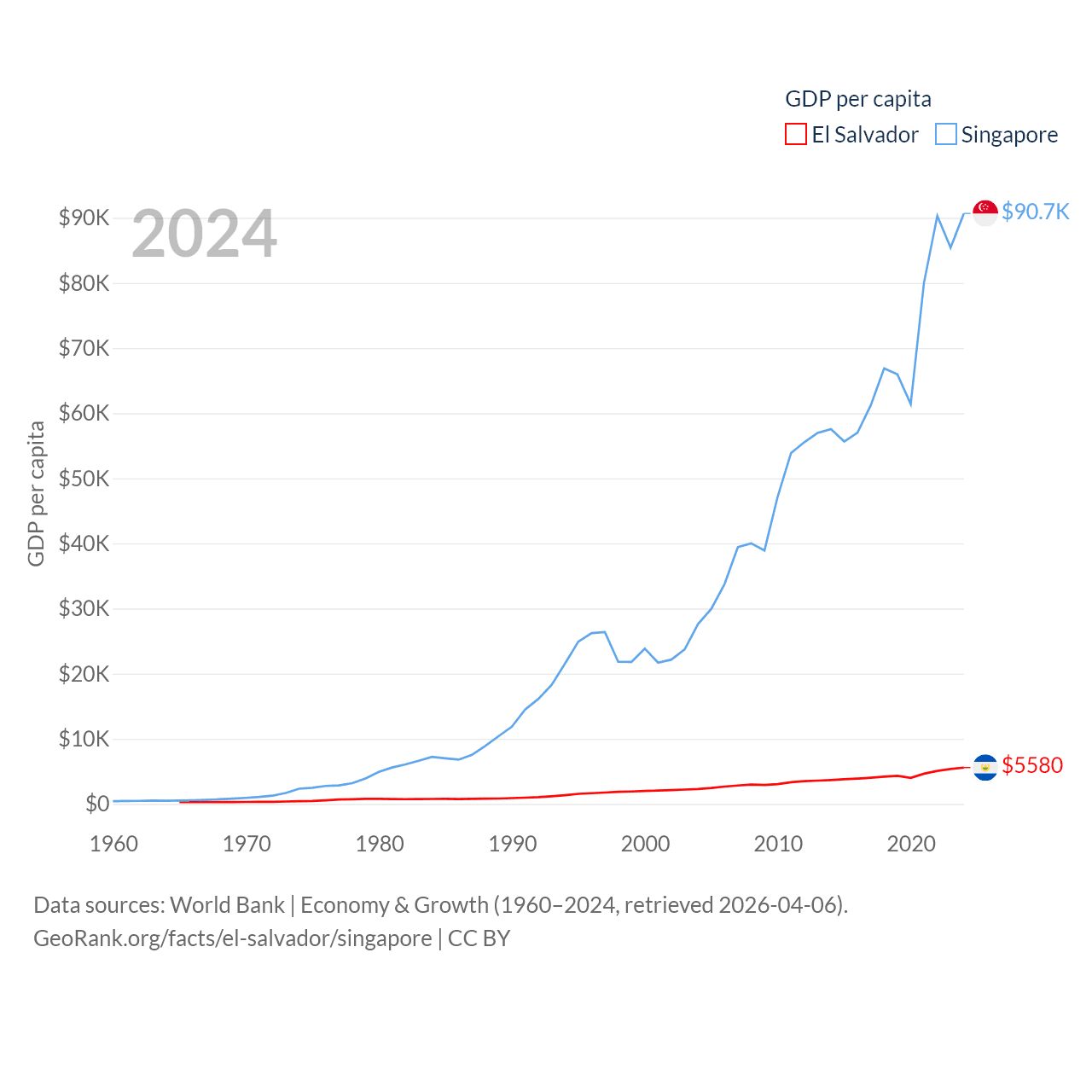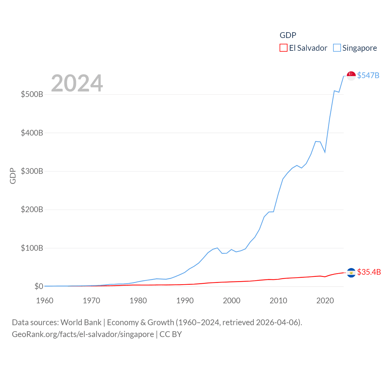 By GDP, El Salvador ranks 105/197 ($35.4B) and Singapore ranks 28/197 ($547B). By GDP per capita, El Salvador ranks 116/197 ($5,580), while Singapore ranks 7/197 ($90,674).