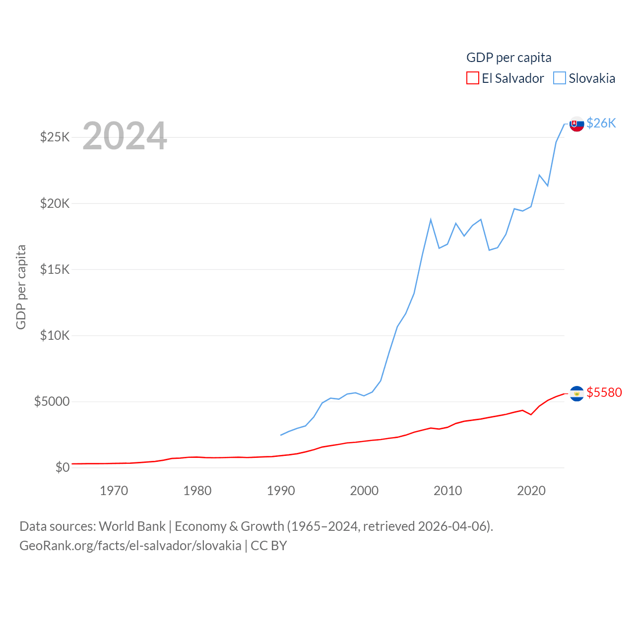 By GDP, El Salvador ranks 105/197 ($35.4B) and Slovakia ranks 61/197 ($141B). By GDP per capita, El Salvador ranks 116/197 ($5,580), while Slovakia ranks 47/197 ($25,993).