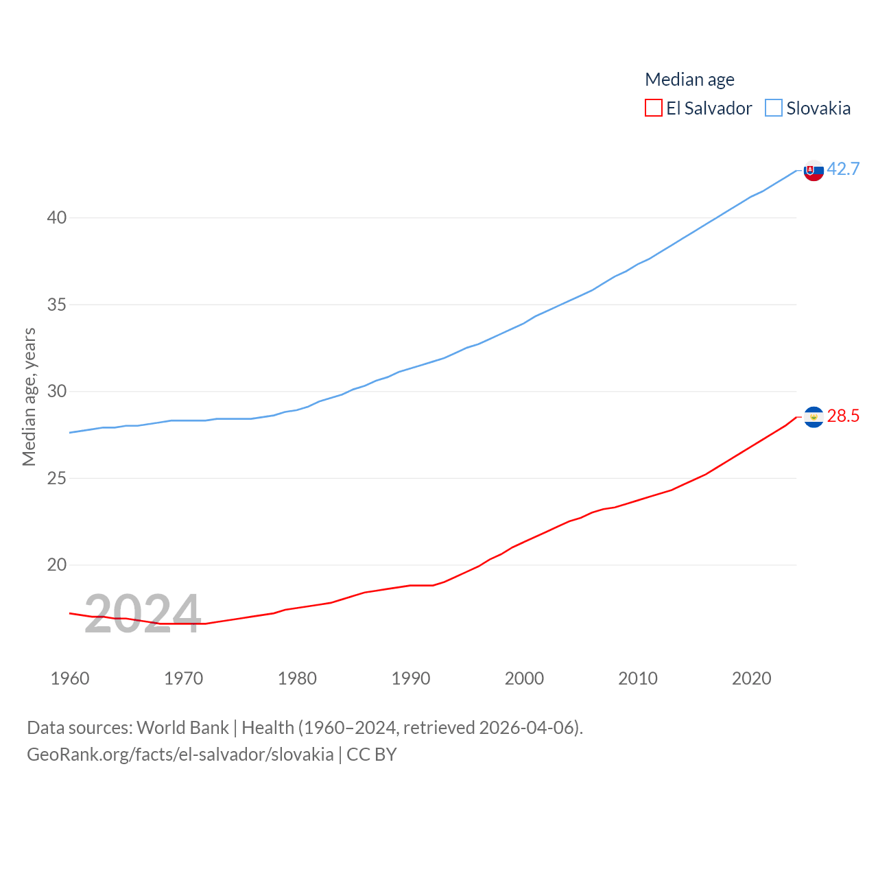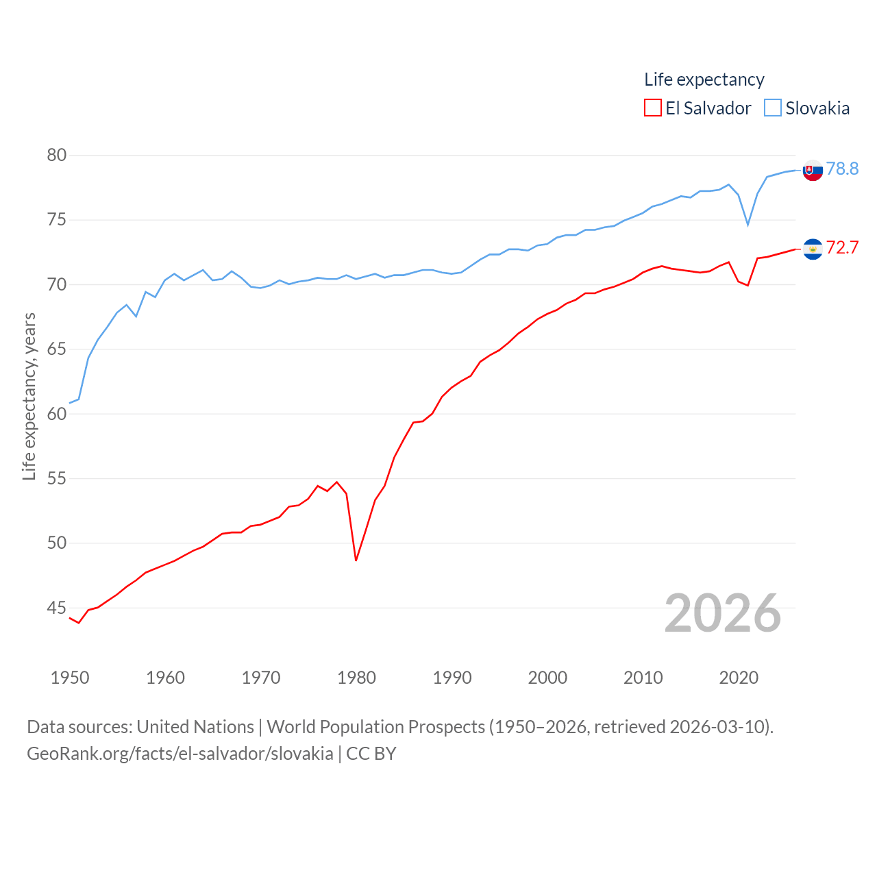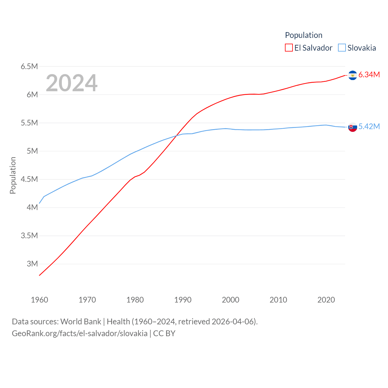 El Salvador has a population of 6.34M (ranked 111/197), compared with 5.42M in Slovakia (ranked 119/197). El Salvador's land area is 8,000 sq mi versus 18,564 sq mi for Slovakia (ranked 150th vs. 128th).