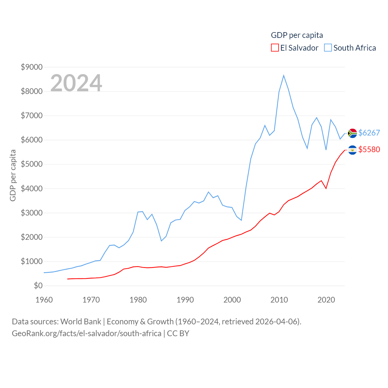 By GDP, El Salvador ranks 105/197 ($35.4B) and South Africa ranks 40/197 ($401B). By GDP per capita, El Salvador ranks 116/197 ($5,580), while South Africa ranks 111/197 ($6,267).