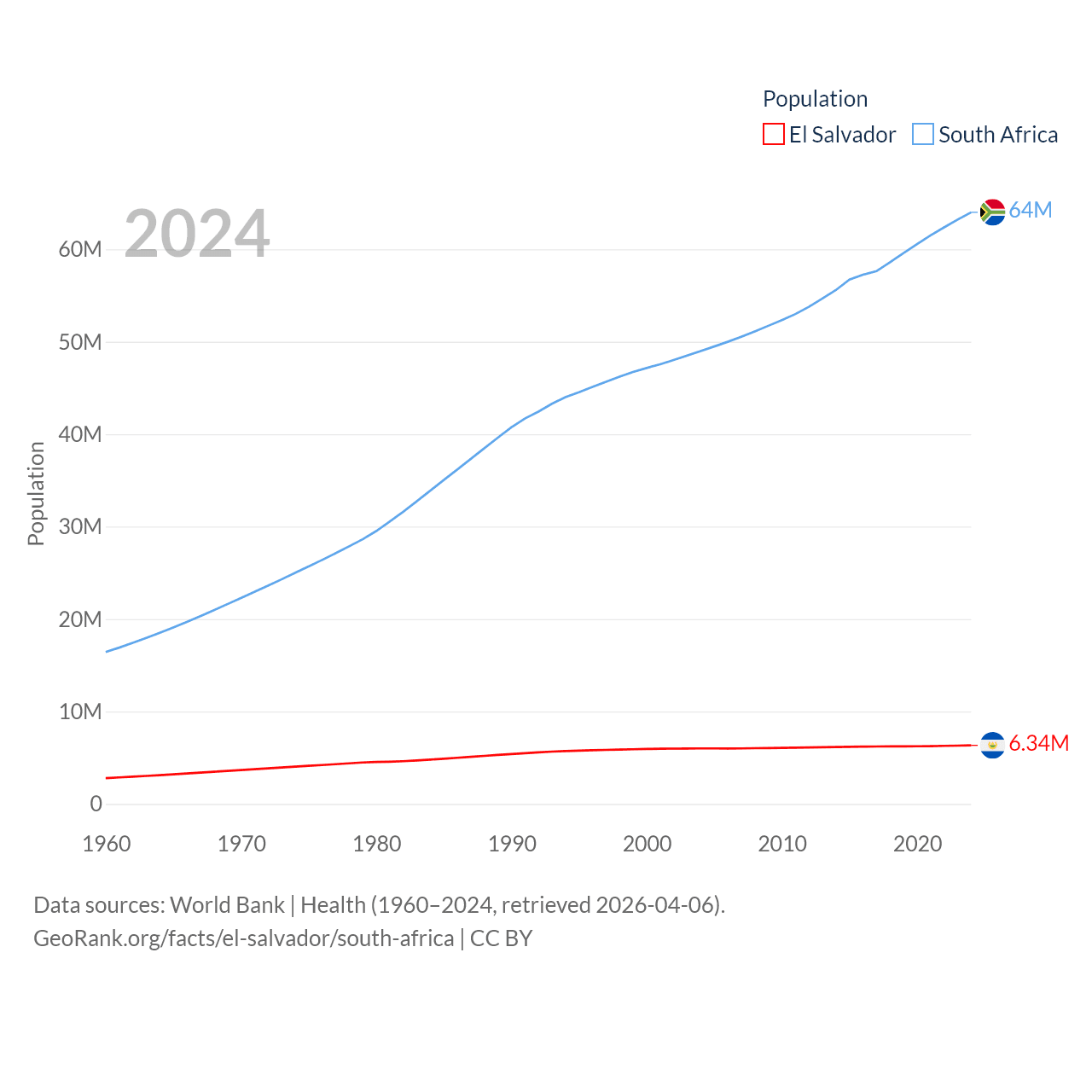 El Salvador has a population of 6.34M (ranked 111/197), compared with 64M in South Africa (ranked 24/197). El Salvador's land area is 8,000 sq mi versus 468,377 sq mi for South Africa (ranked 150th vs. 24th).