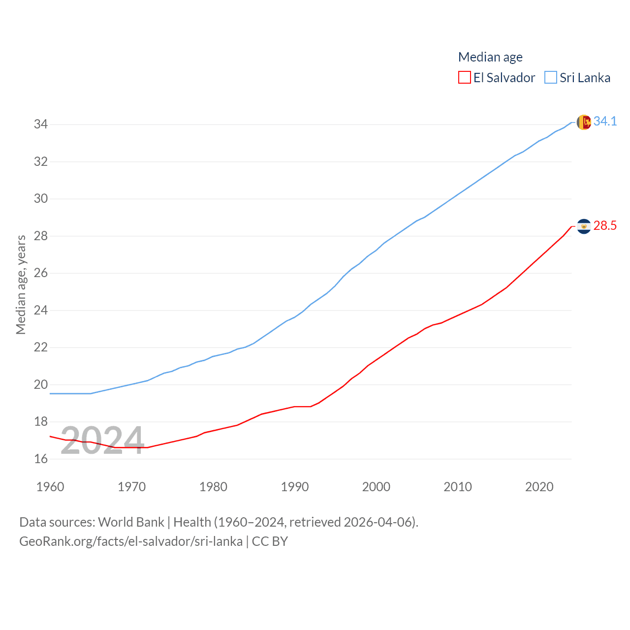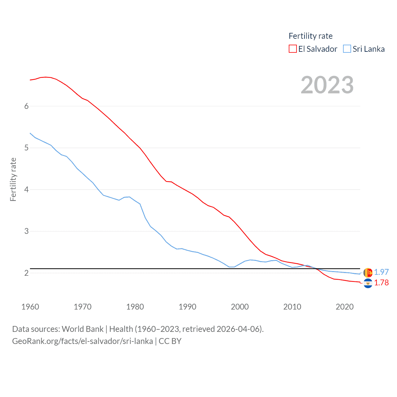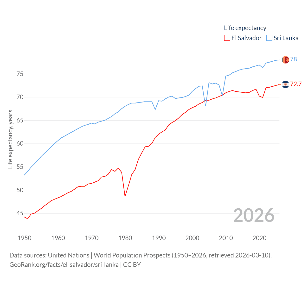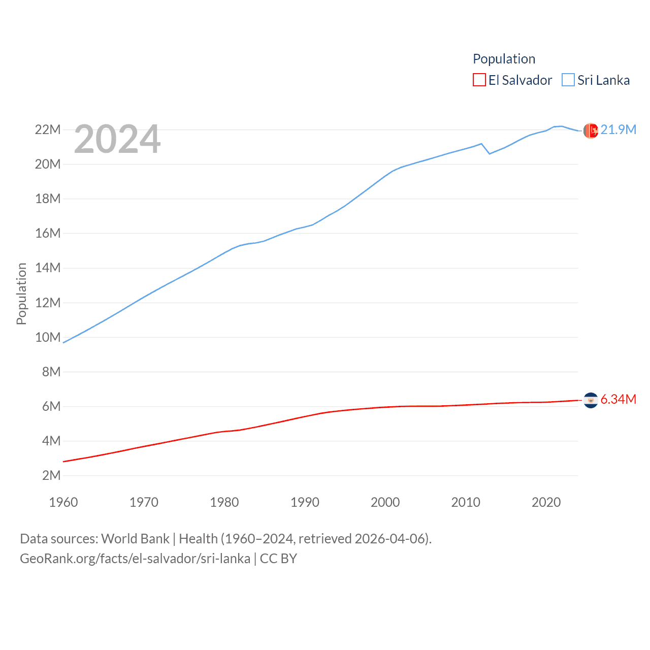 El Salvador has a population of 6.34M (ranked 111/197), compared with 21.9M in Sri Lanka (ranked 61/197). El Salvador's land area is 8,000 sq mi versus 23,884 sq mi for Sri Lanka (ranked 150th vs. 122nd).
