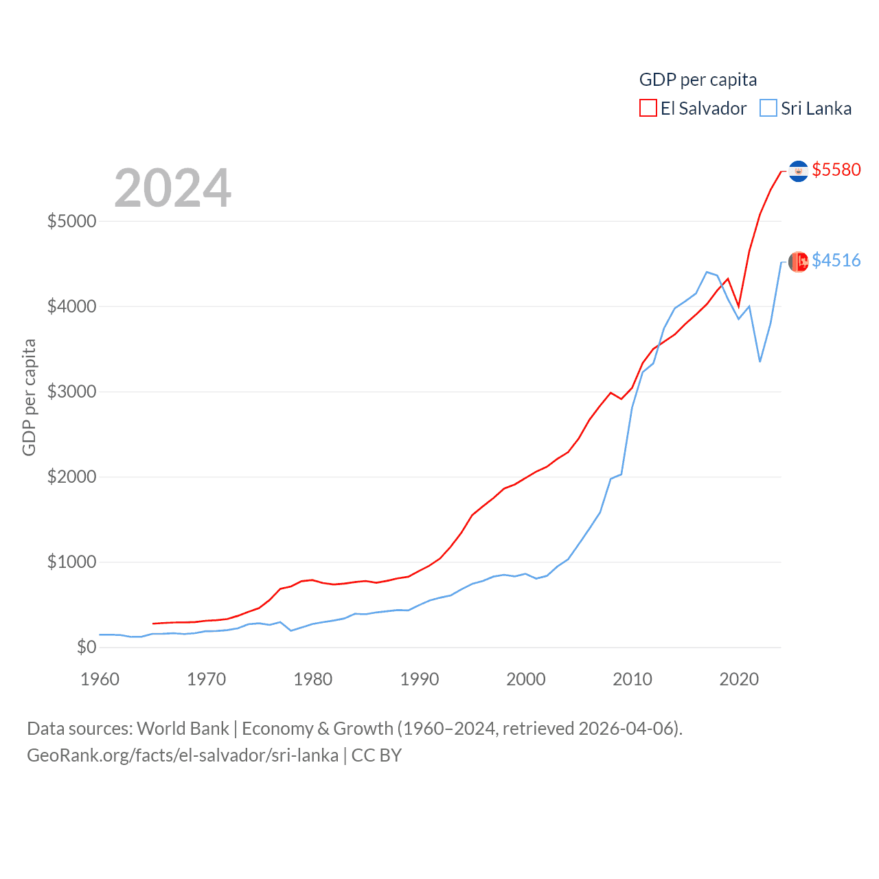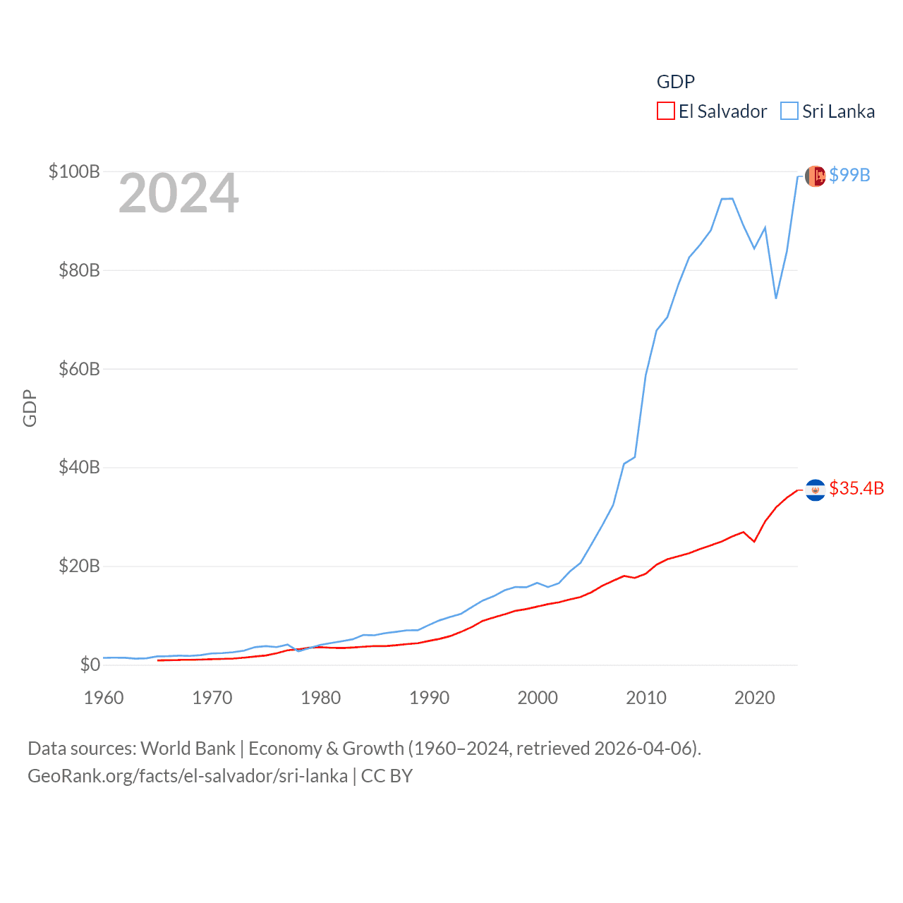 By GDP, El Salvador ranks 105/197 ($35.4B) and Sri Lanka ranks 72/197 ($99B). By GDP per capita, El Salvador ranks 116/197 ($5,580), while Sri Lanka ranks 124/197 ($4,516).
