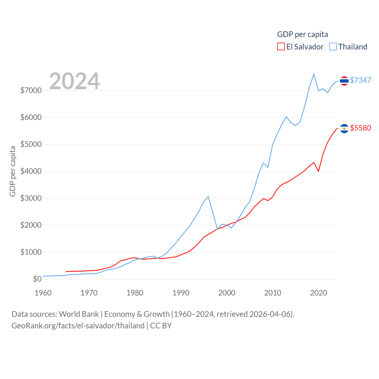 By GDP, El Salvador ranks 105/197 ($35.4B) and Thailand ranks 31/197 ($527B). By GDP per capita, El Salvador ranks 116/197 ($5,580), while Thailand ranks 100/197 ($7,347).