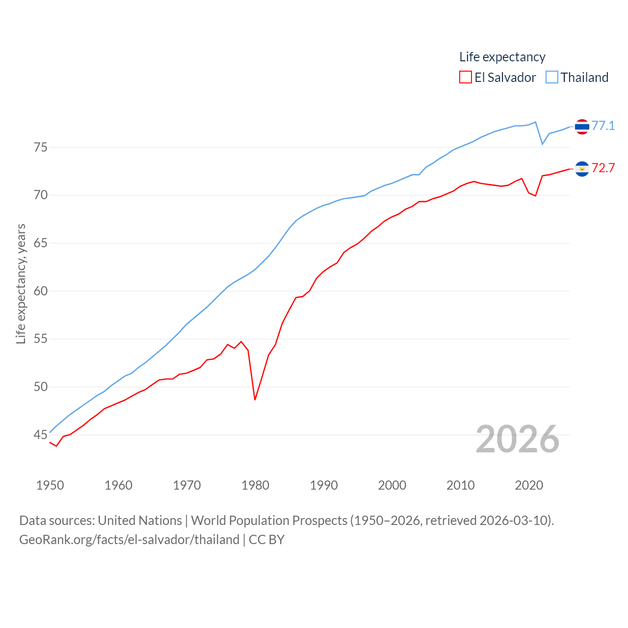 El Salvador has a population of 6.34M (ranked 111/197), compared with 71.7M in Thailand (ranked 20/197). El Salvador's land area is 8,000 sq mi versus 197,256 sq mi for Thailand (ranked 150th vs. 50th).