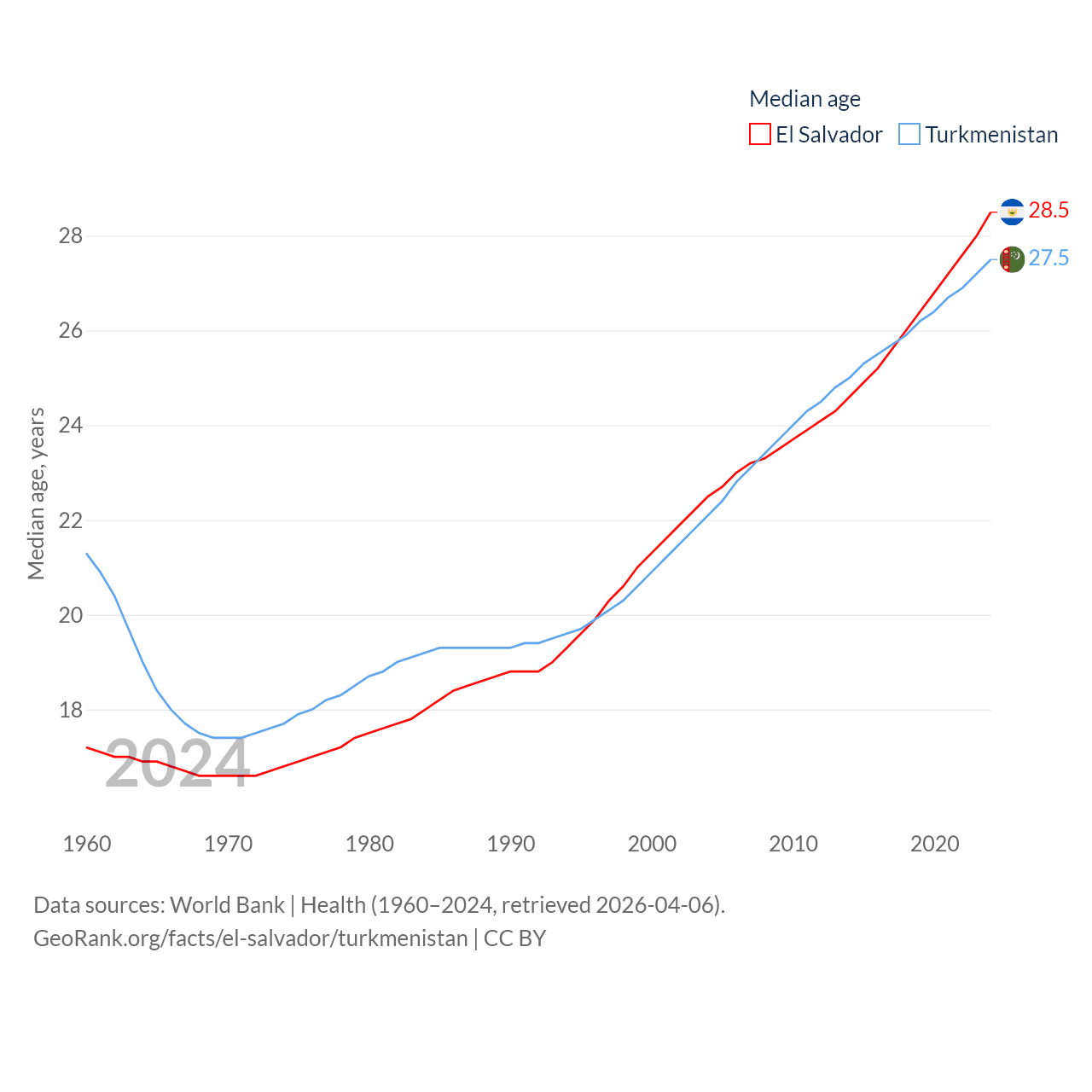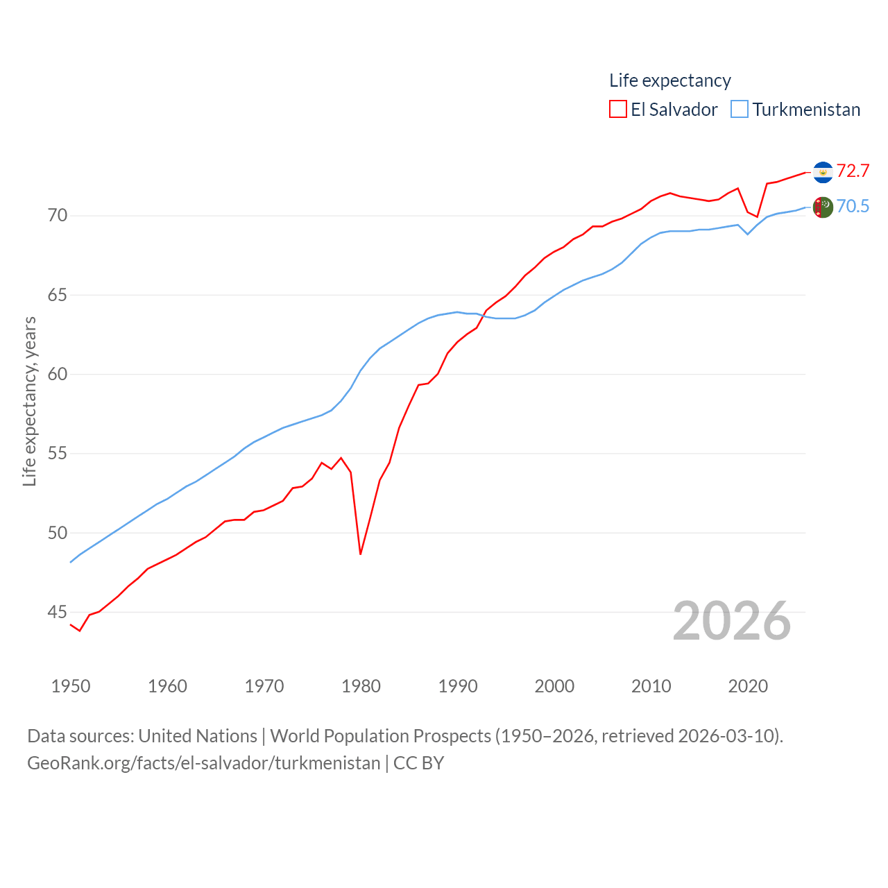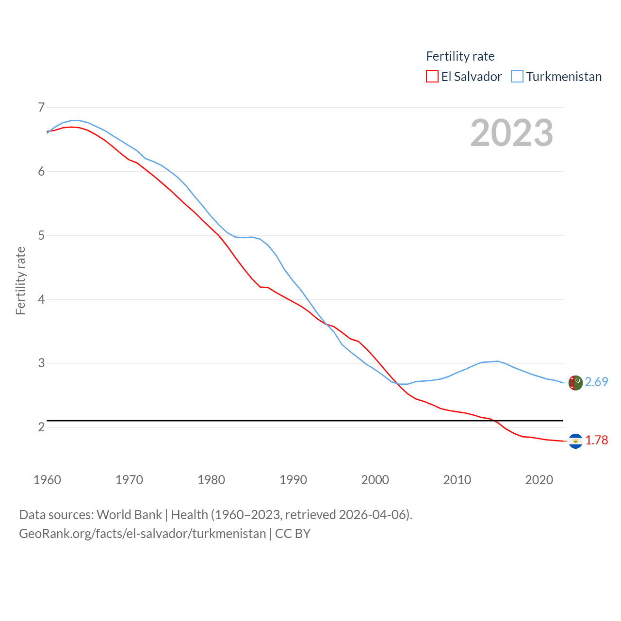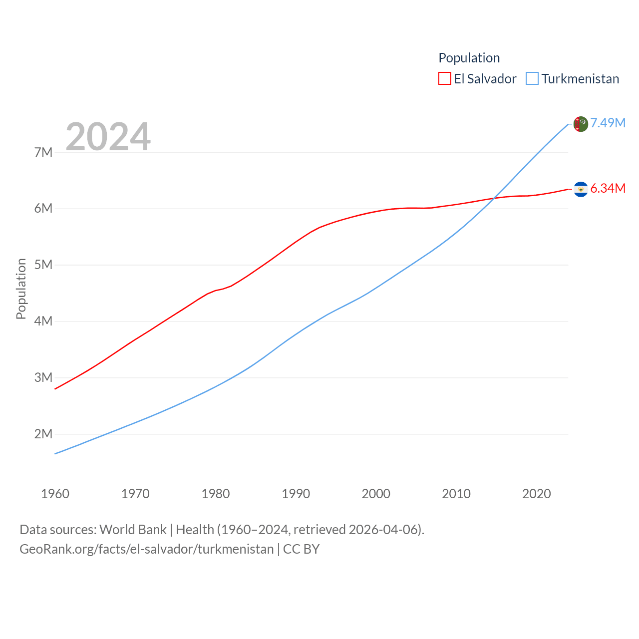 El Salvador has a population of 6.34M (ranked 111/197), compared with 7.49M in Turkmenistan (ranked 104/197). El Salvador's land area is 8,000 sq mi versus 181,441 sq mi for Turkmenistan (ranked 150th vs. 53rd).