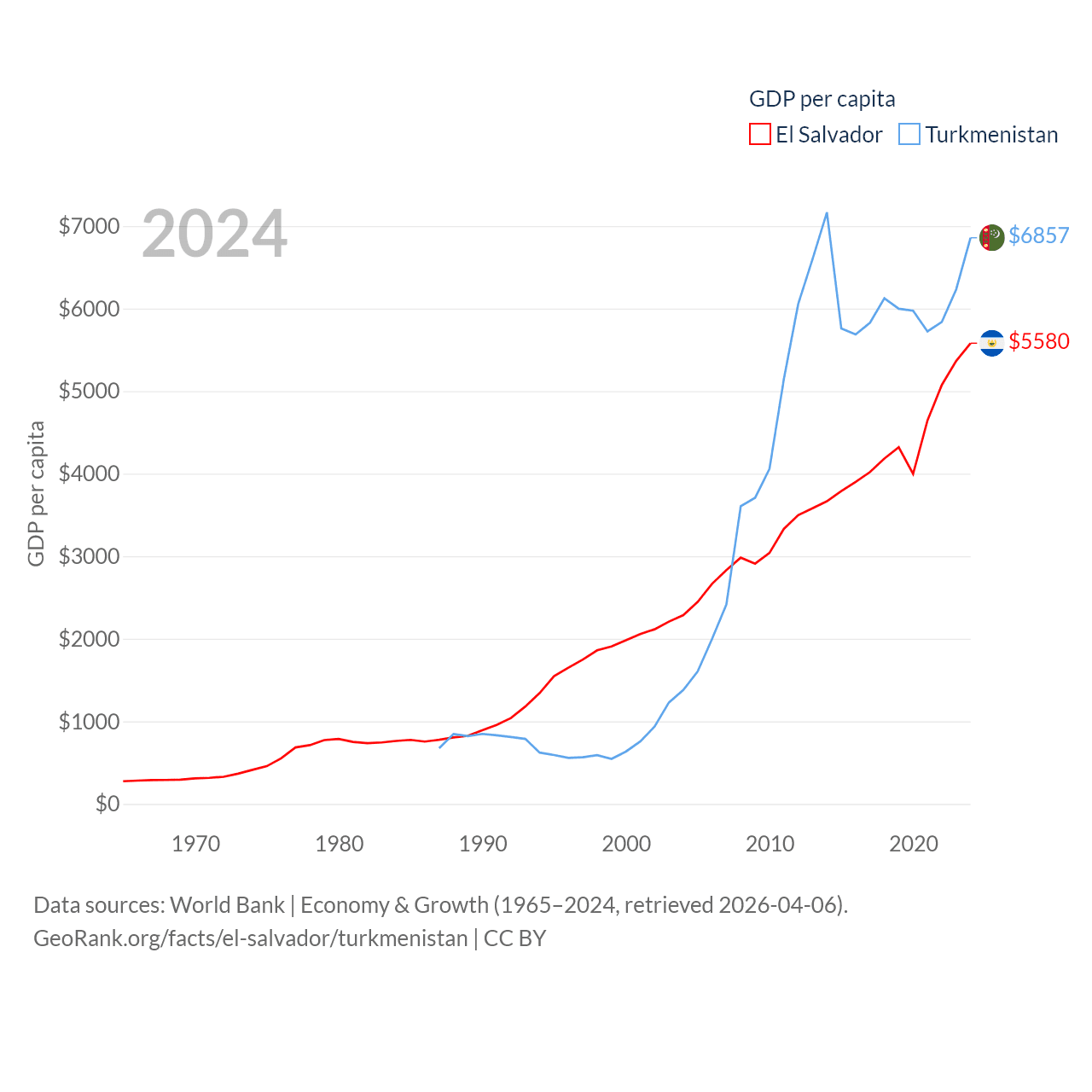 By GDP, El Salvador ranks 105/197 ($35.4B) and Turkmenistan ranks 92/197 ($51.4B). By GDP per capita, El Salvador ranks 116/197 ($5,580), while Turkmenistan ranks 104/197 ($6,857).