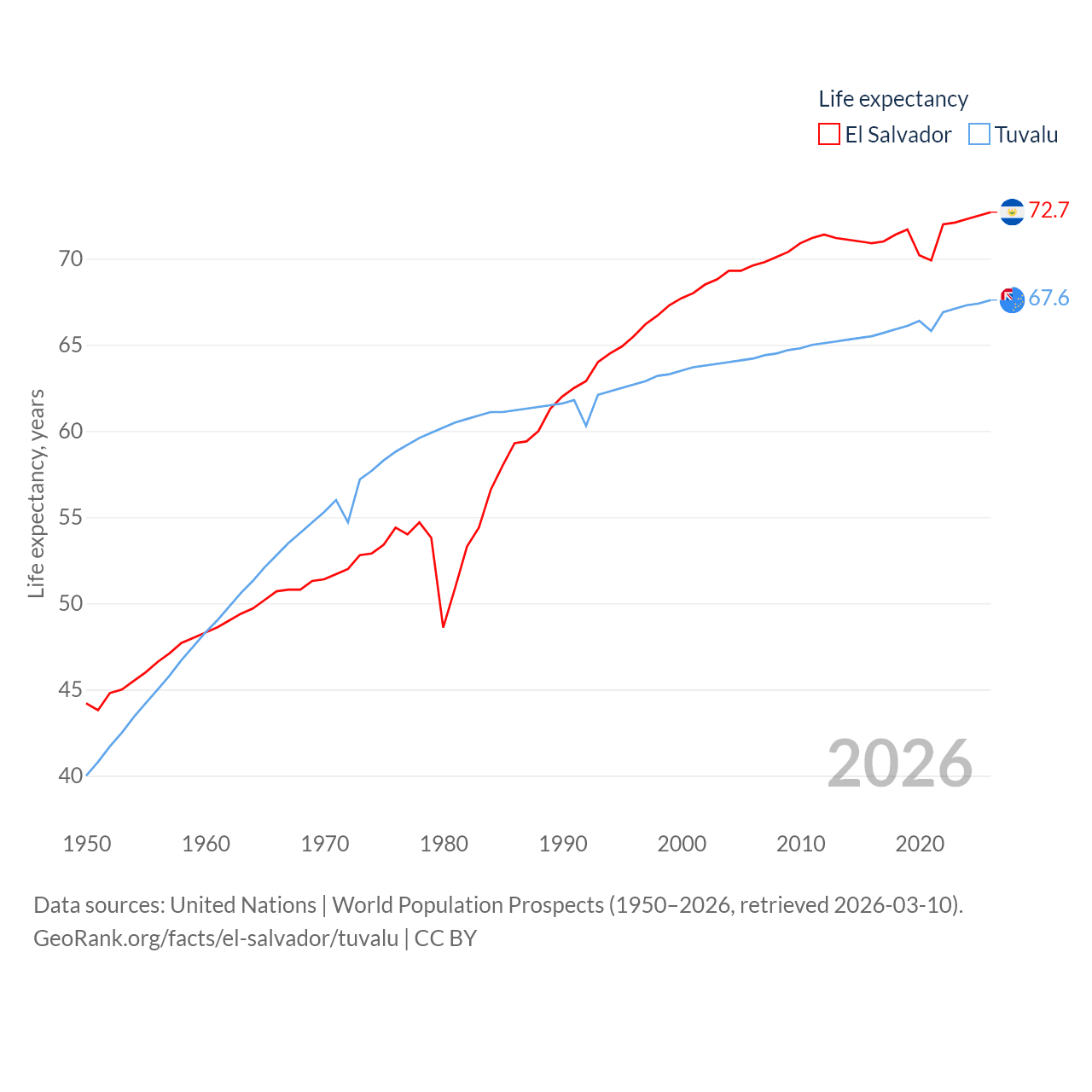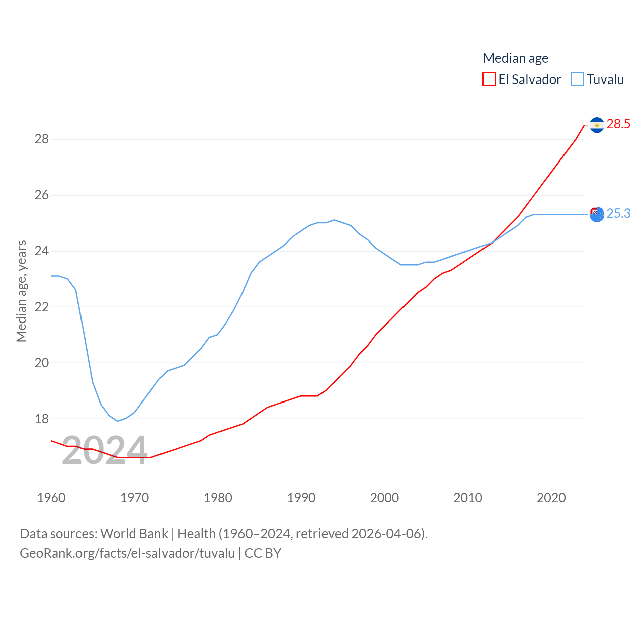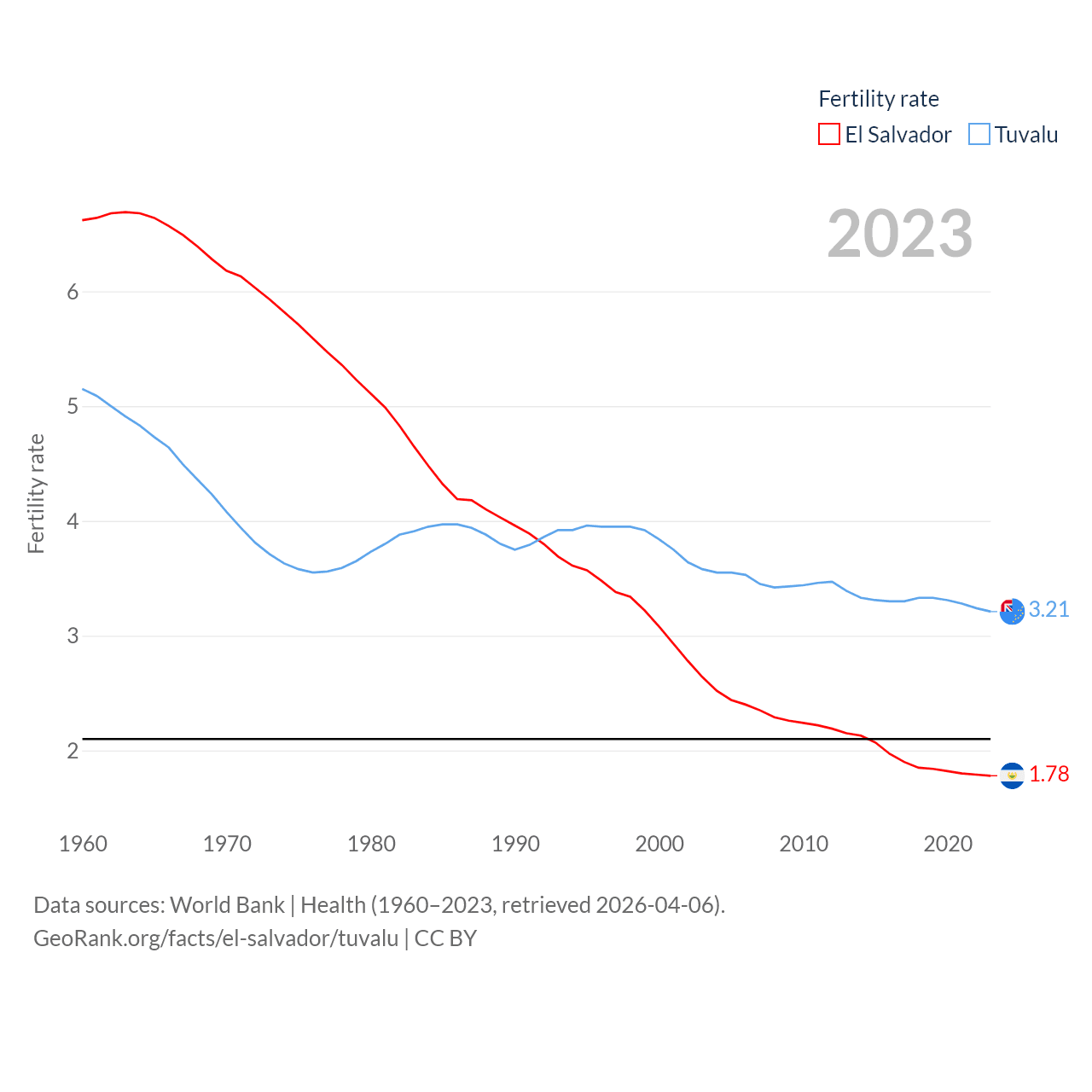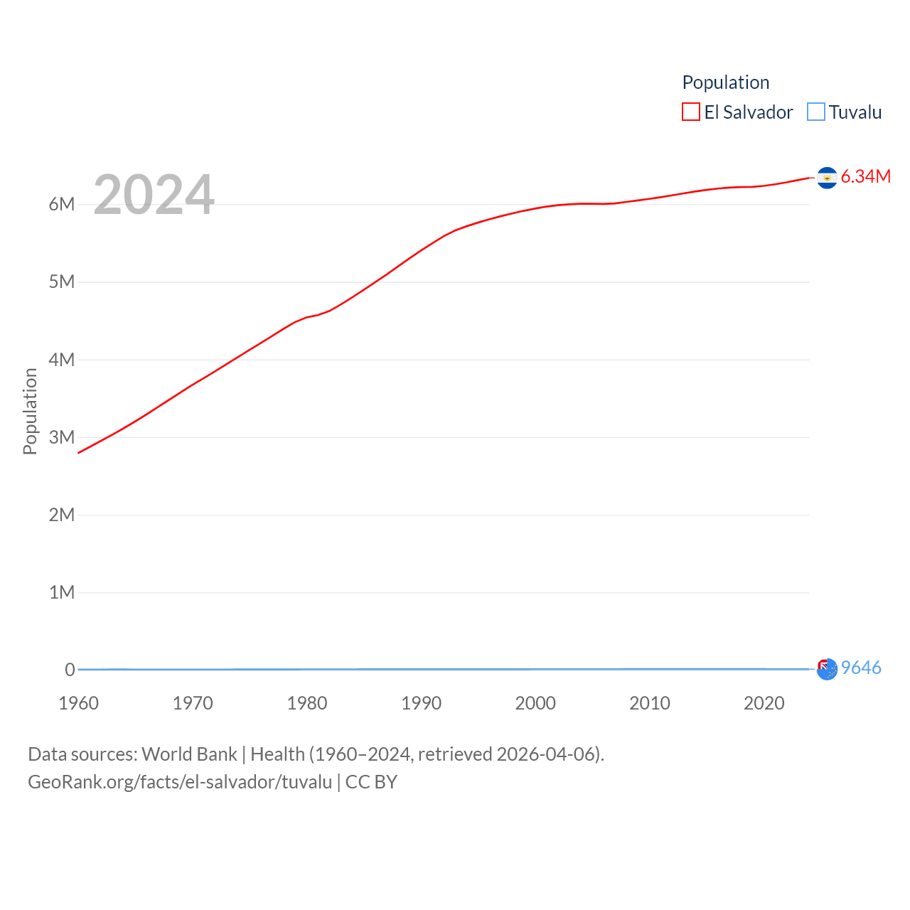El Salvador has a population of 6.34M (ranked 111/197), compared with 9.65K in Tuvalu (ranked 196/197). El Salvador's land area is 8,000 sq mi versus 11.6 sq mi for Tuvalu (ranked 150th vs. 194th).
