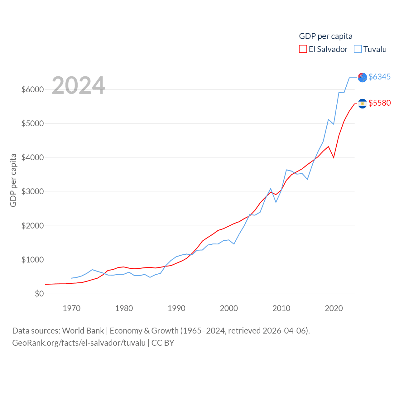 By GDP, El Salvador ranks 105/197 ($35.4B) and Tuvalu ranks 196/197 ($62.3M). By GDP per capita, El Salvador ranks 116/197 ($5,580), while Tuvalu ranks 110/197 ($6,345).
