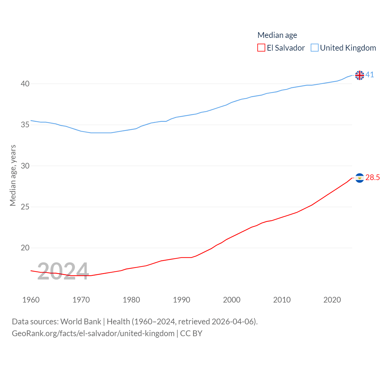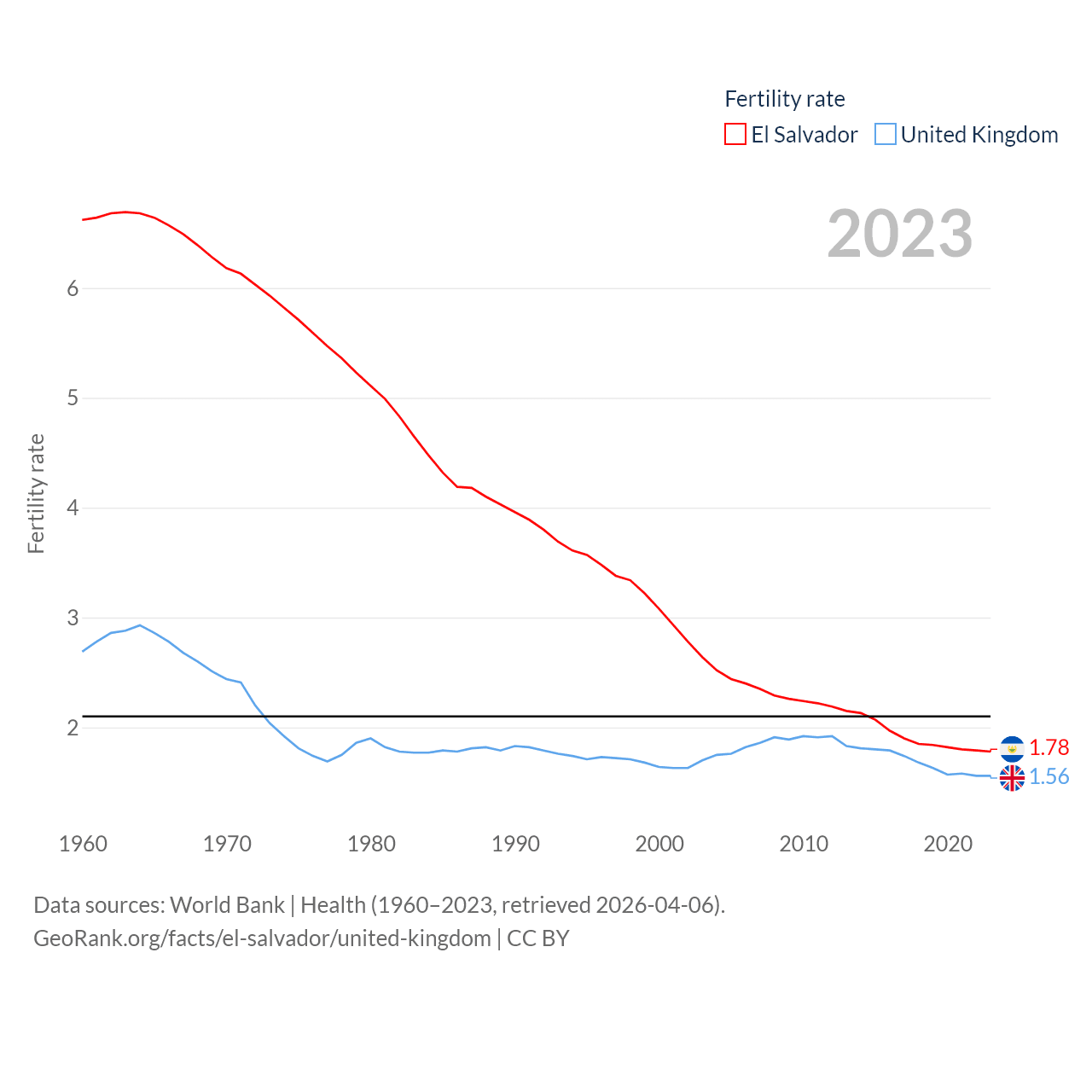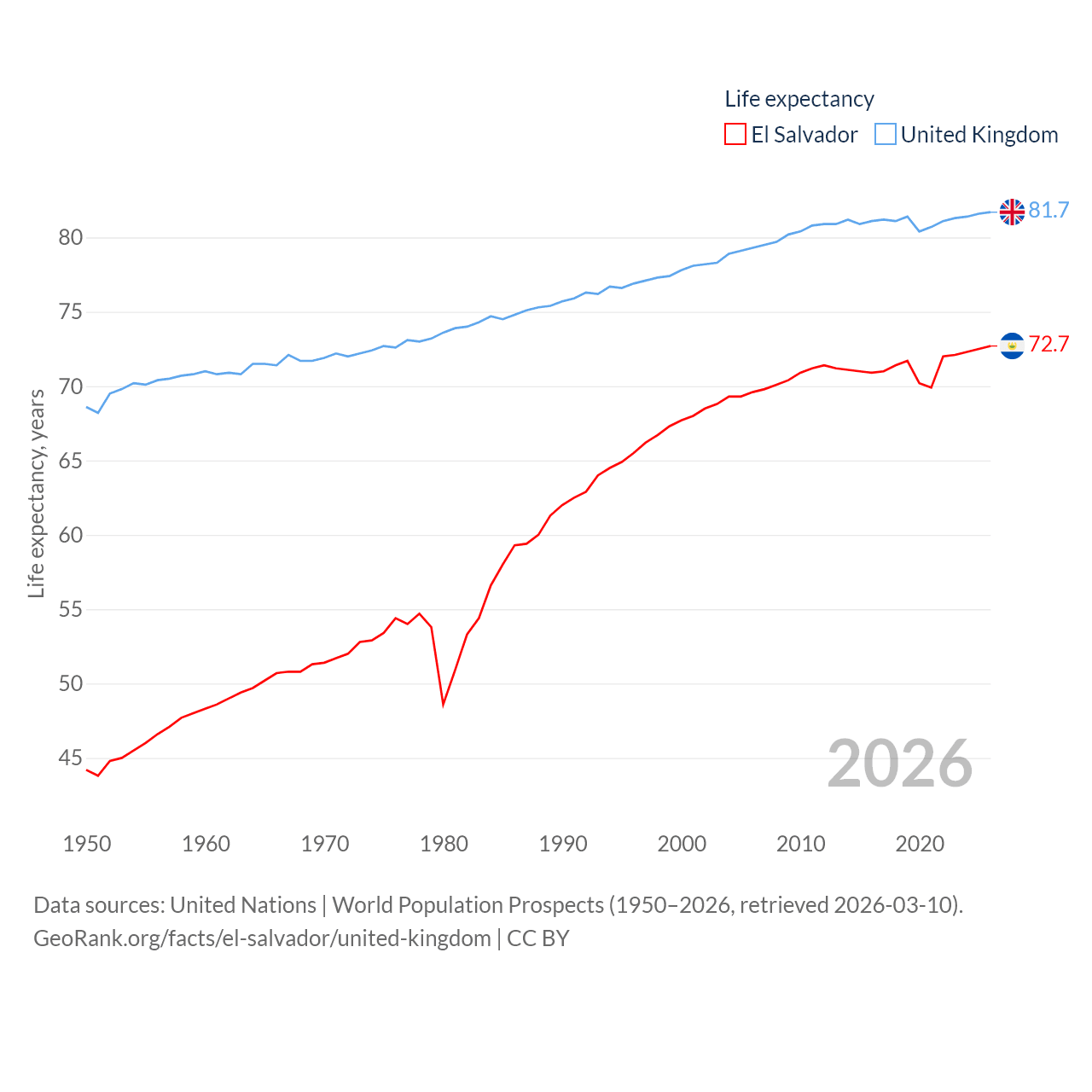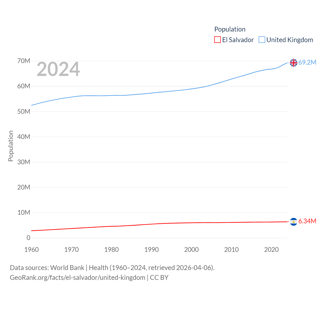 El Salvador has a population of 6.34M (ranked 111/197), compared with 69.2M in The United Kingdom (ranked 21/197). El Salvador's land area is 8,000 sq mi versus 93,410 sq mi for The United Kingdom (ranked 150th vs. 78th).