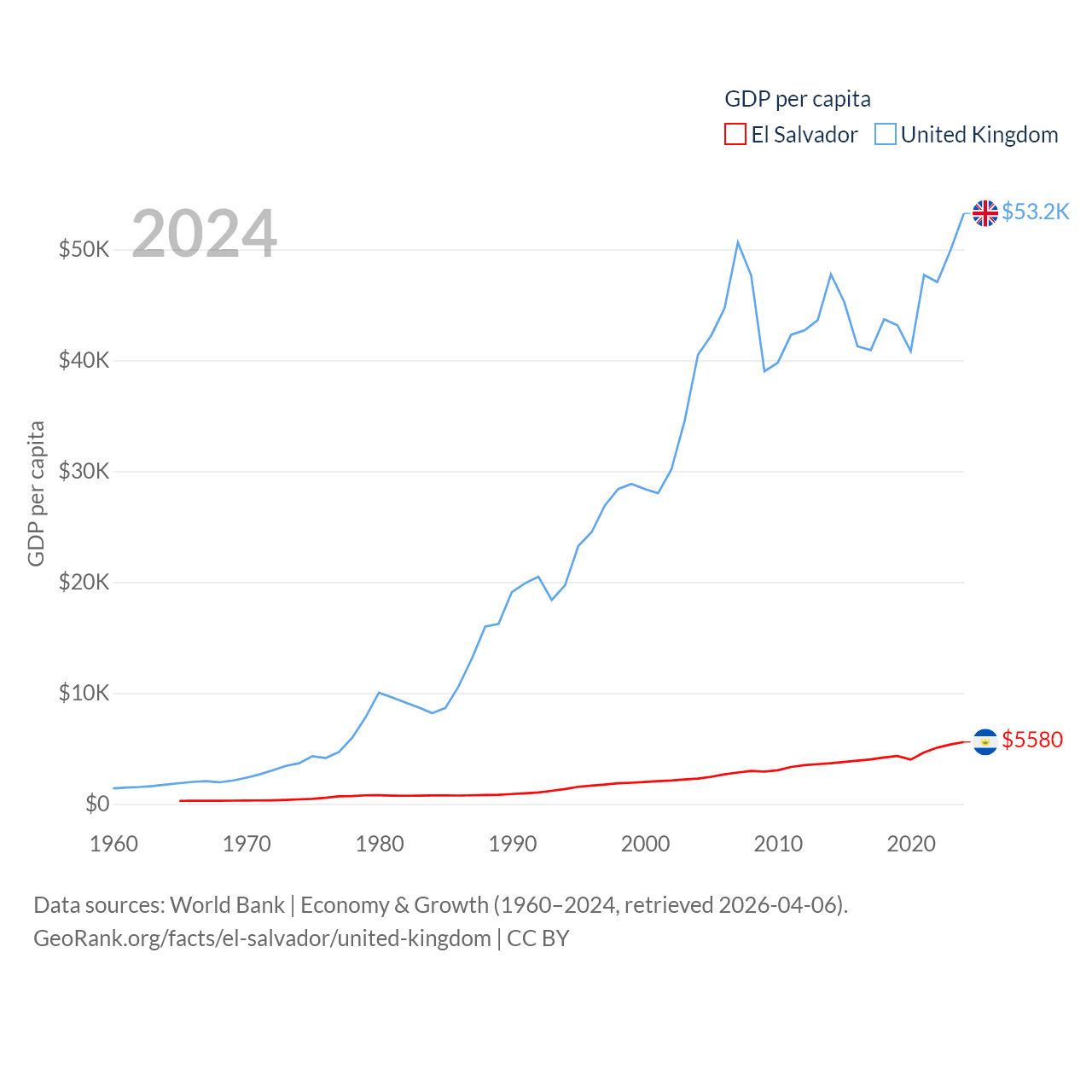 By GDP, El Salvador ranks 105/197 ($35.4B) and The United Kingdom ranks 6/197 ($3.69T). By GDP per capita, El Salvador ranks 116/197 ($5,580), while The United Kingdom ranks 22/197 ($53,246).