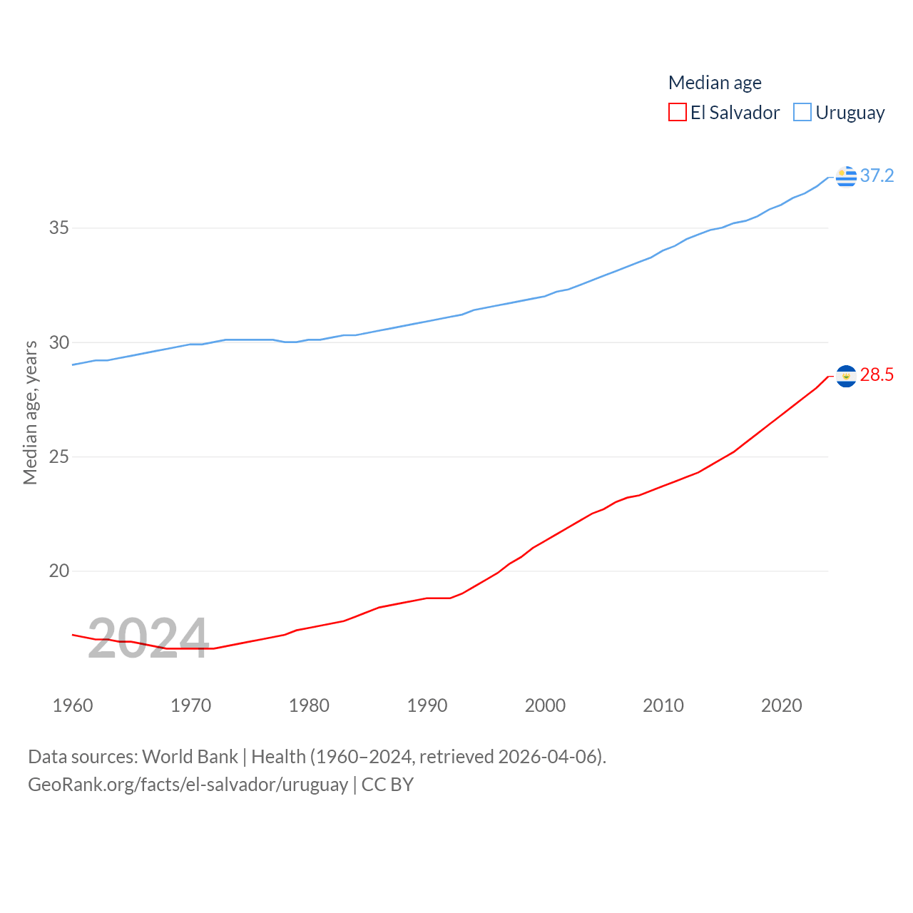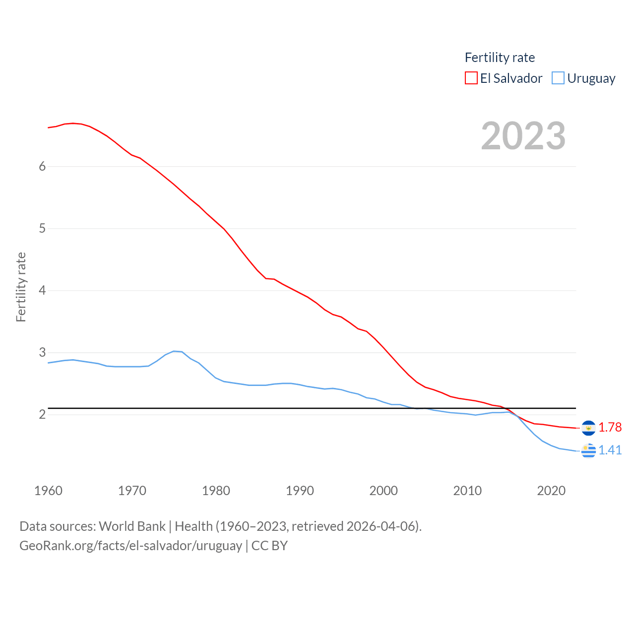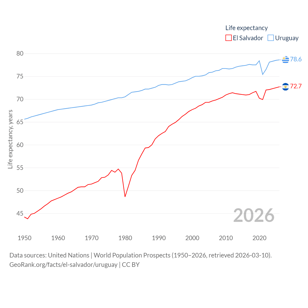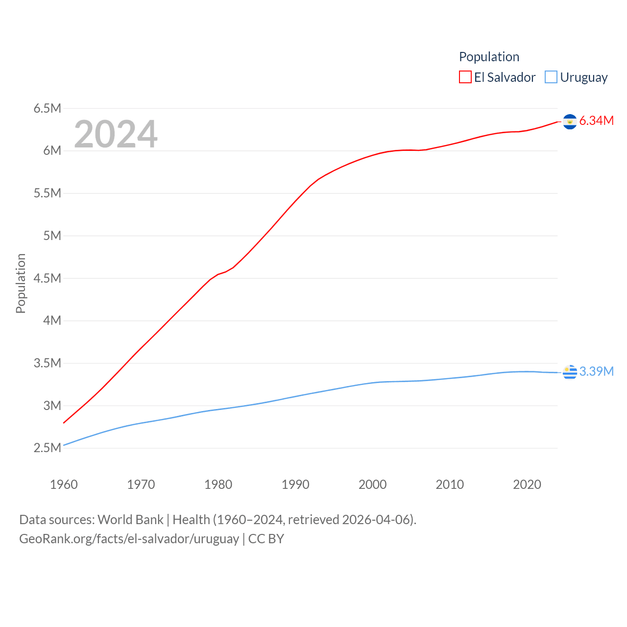 El Salvador has a population of 6.34M (ranked 111/197), compared with 3.39M in Uruguay (ranked 133/197). El Salvador's land area is 8,000 sq mi versus 67,576 sq mi for Uruguay (ranked 150th vs. 89th).