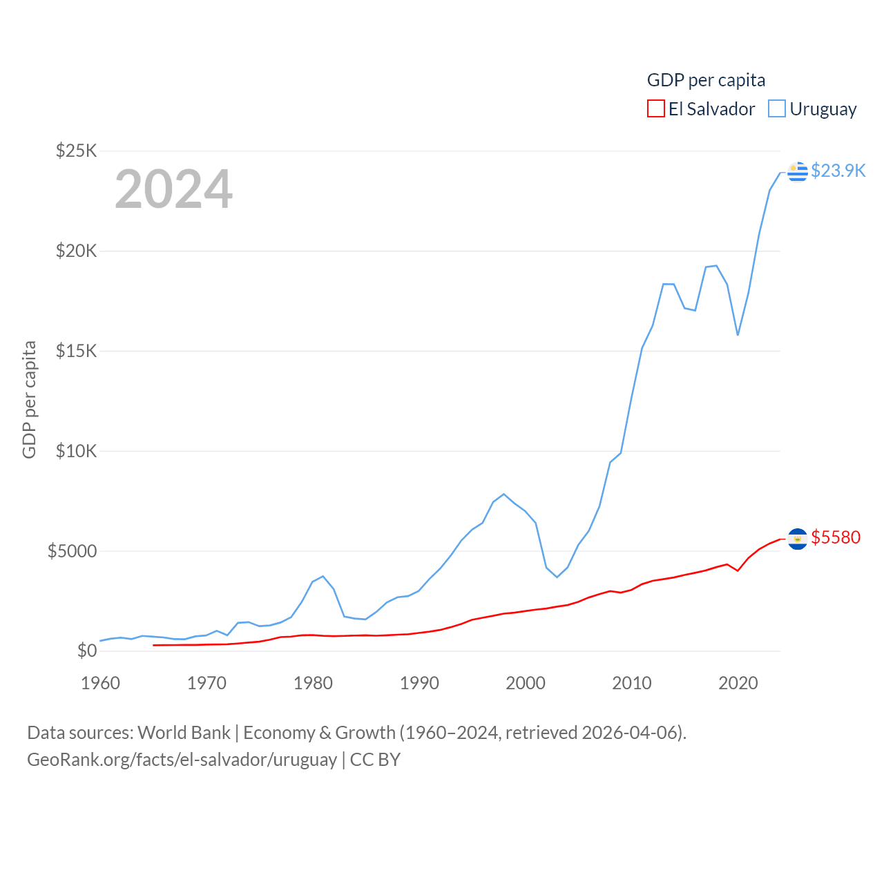 By GDP, El Salvador ranks 105/197 ($35.4B) and Uruguay ranks 81/197 ($81B). By GDP per capita, El Salvador ranks 116/197 ($5,580), while Uruguay ranks 52/197 ($23,907).