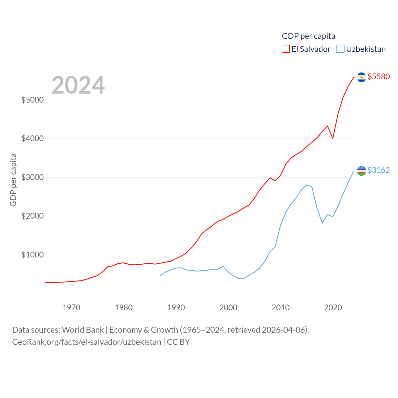 By GDP, El Salvador ranks 105/197 ($35.4B) and Uzbekistan ranks 66/197 ($115B). By GDP per capita, El Salvador ranks 116/197 ($5,580), while Uzbekistan ranks 139/197 ($3,162).