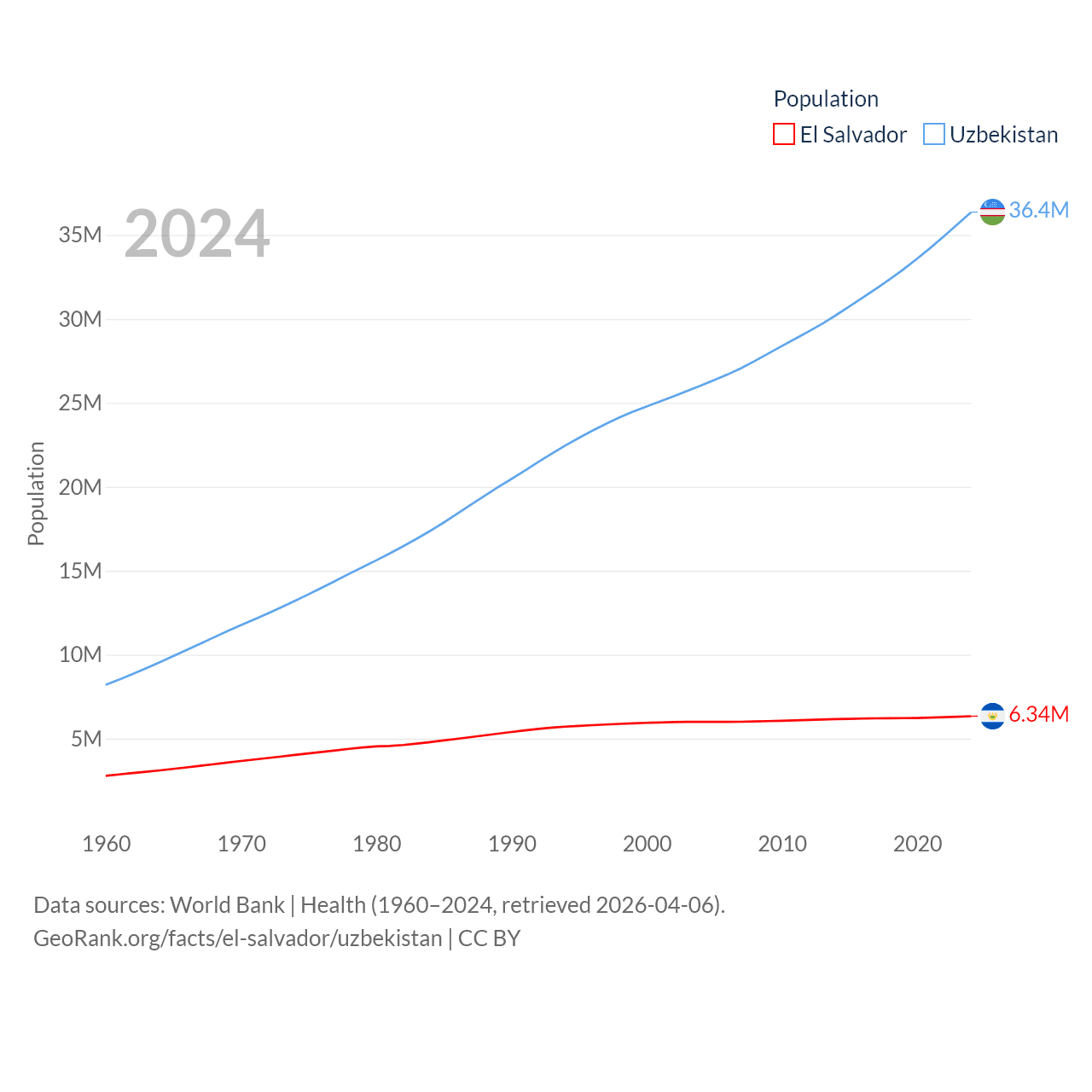 El Salvador has a population of 6.34M (ranked 111/197), compared with 36.4M in Uzbekistan (ranked 43/197). El Salvador's land area is 8,000 sq mi versus 170,136 sq mi for Uzbekistan (ranked 150th vs. 56th).