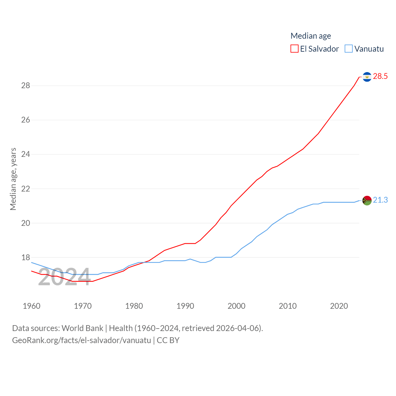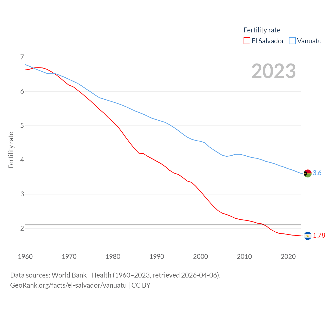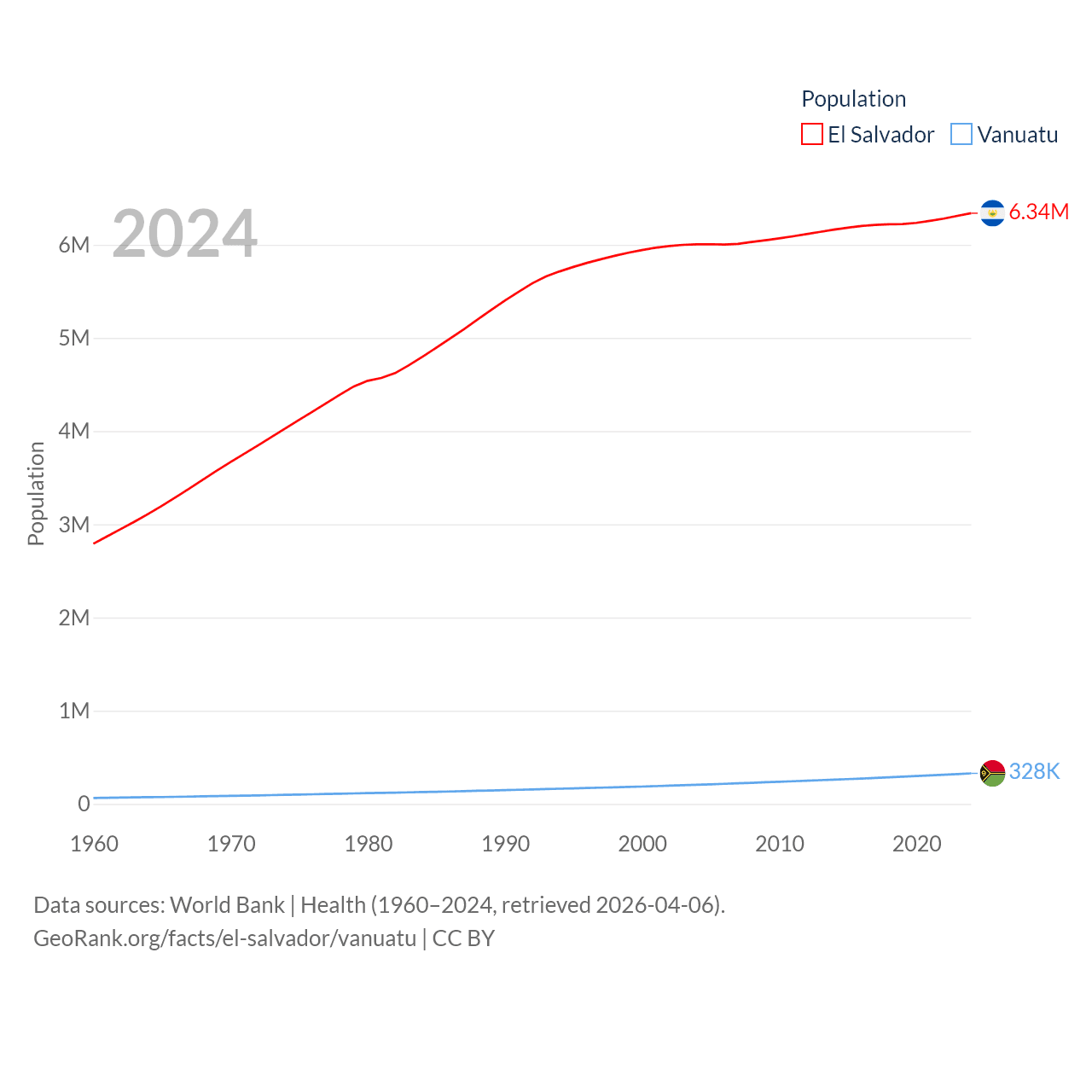 El Salvador has a population of 6.34M (ranked 111/197), compared with 328K in Vanuatu (ranked 174/197). El Salvador's land area is 8,000 sq mi versus 4,707 sq mi for Vanuatu (ranked 150th vs. 157th).