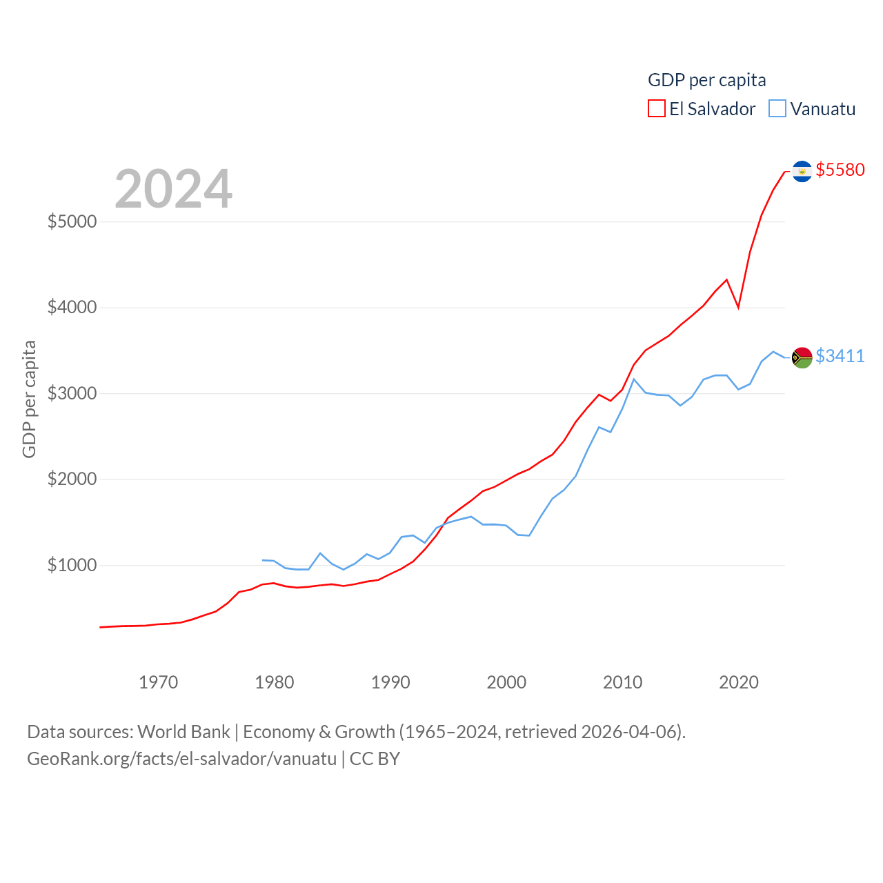 By GDP, El Salvador ranks 105/197 ($35.4B) and Vanuatu ranks 188/197 ($1.12B). By GDP per capita, El Salvador ranks 116/197 ($5,580), while Vanuatu ranks 137/197 ($3,411).