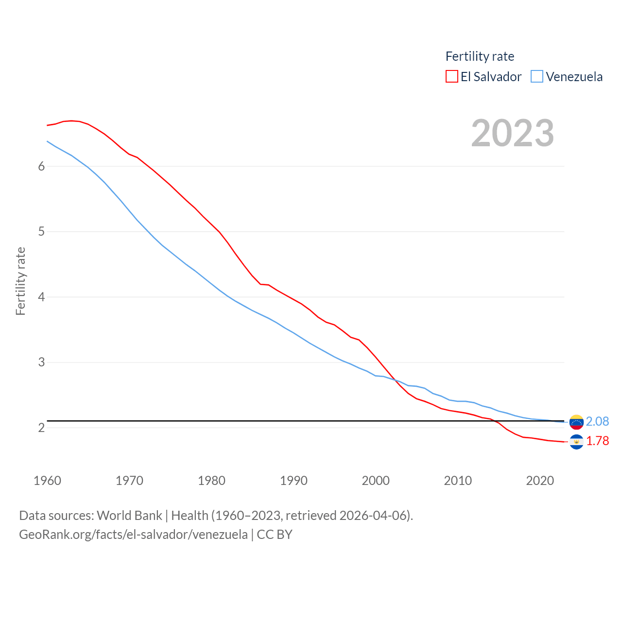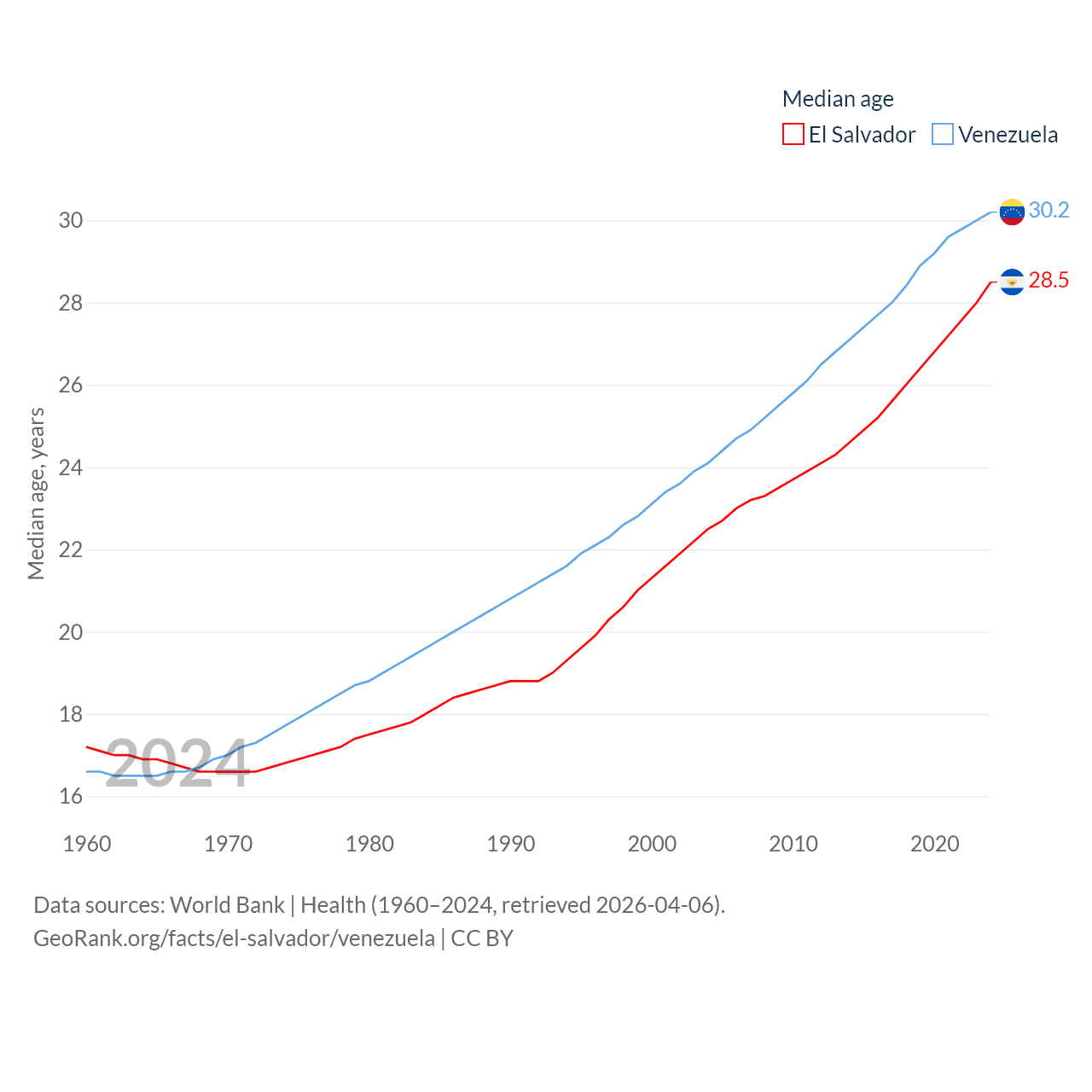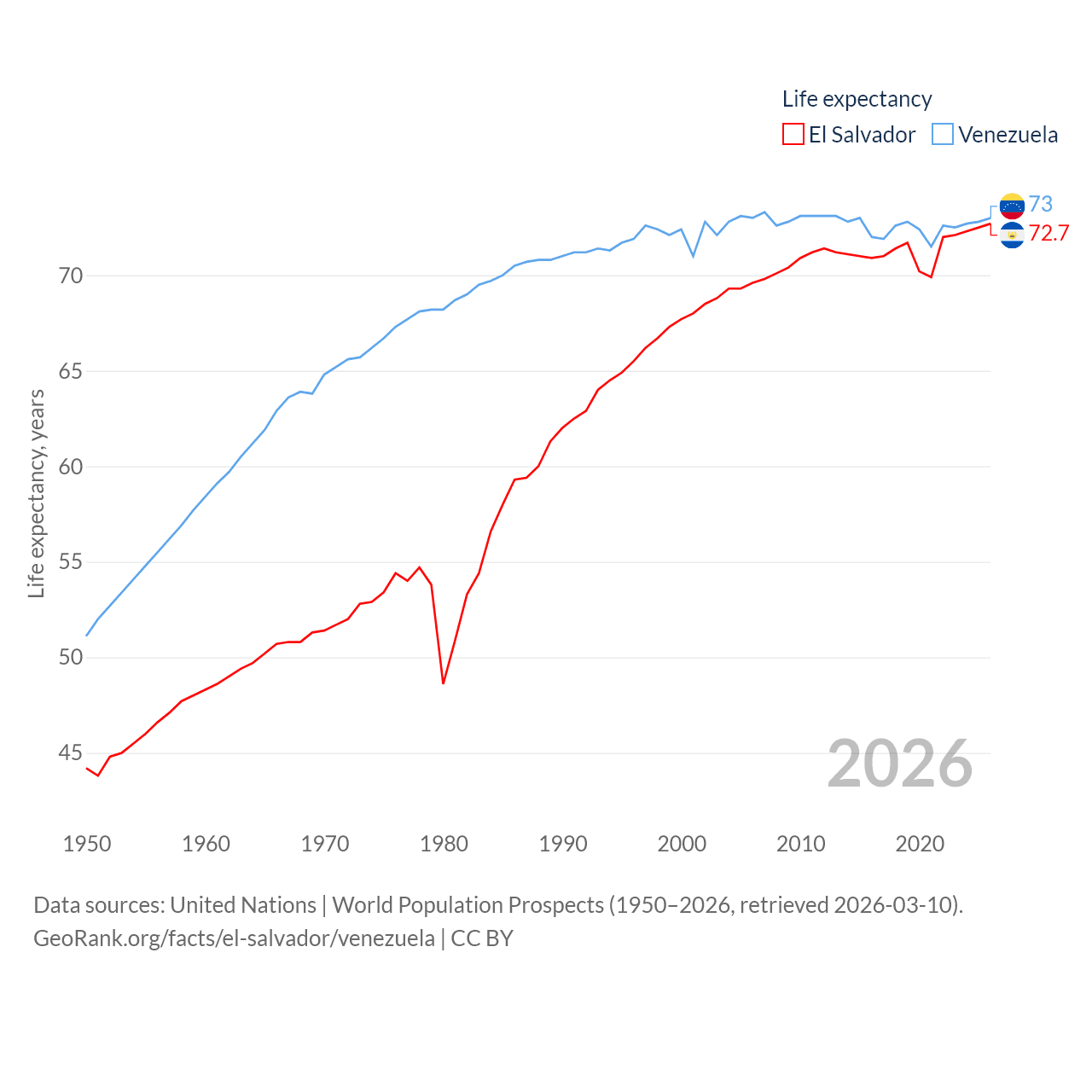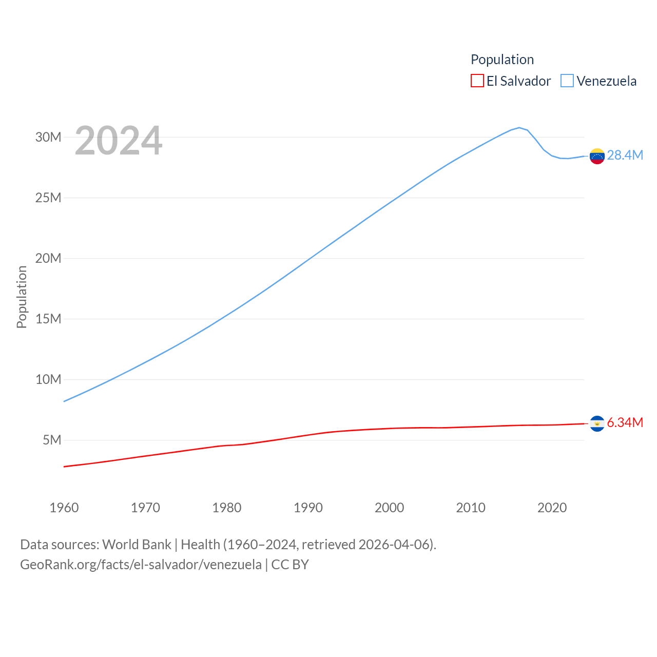 El Salvador has a population of 6.34M (ranked 111/197), compared with 28.4M in Venezuela (ranked 53/197). El Salvador's land area is 8,000 sq mi versus 340,561 sq mi for Venezuela (ranked 150th vs. 32nd).