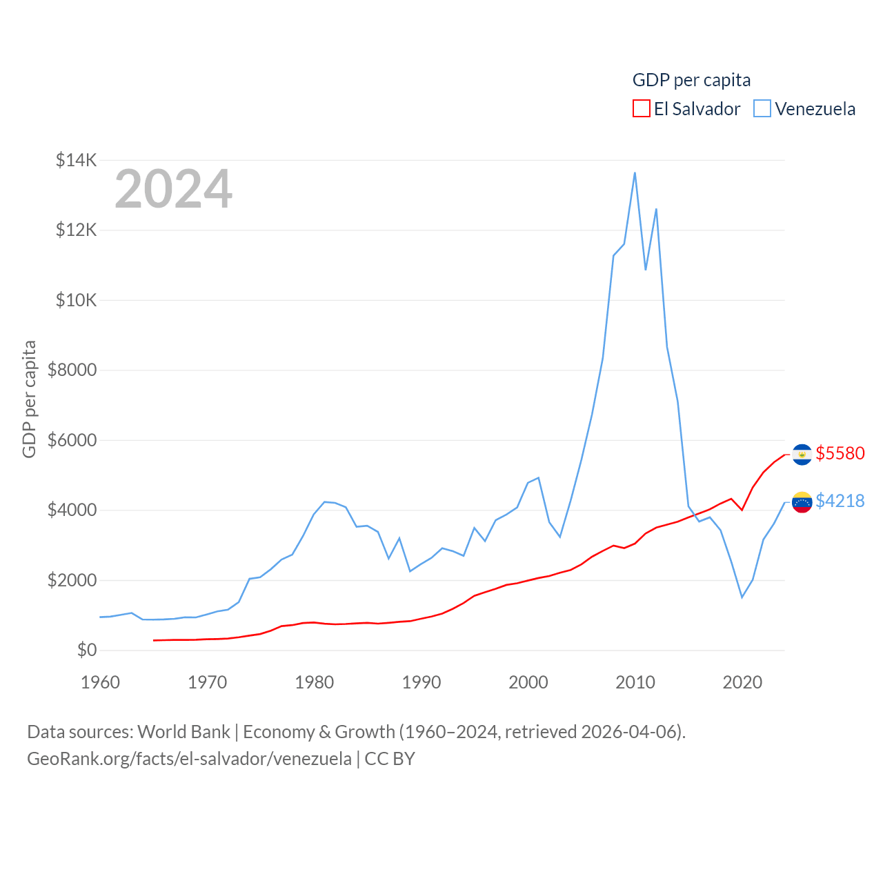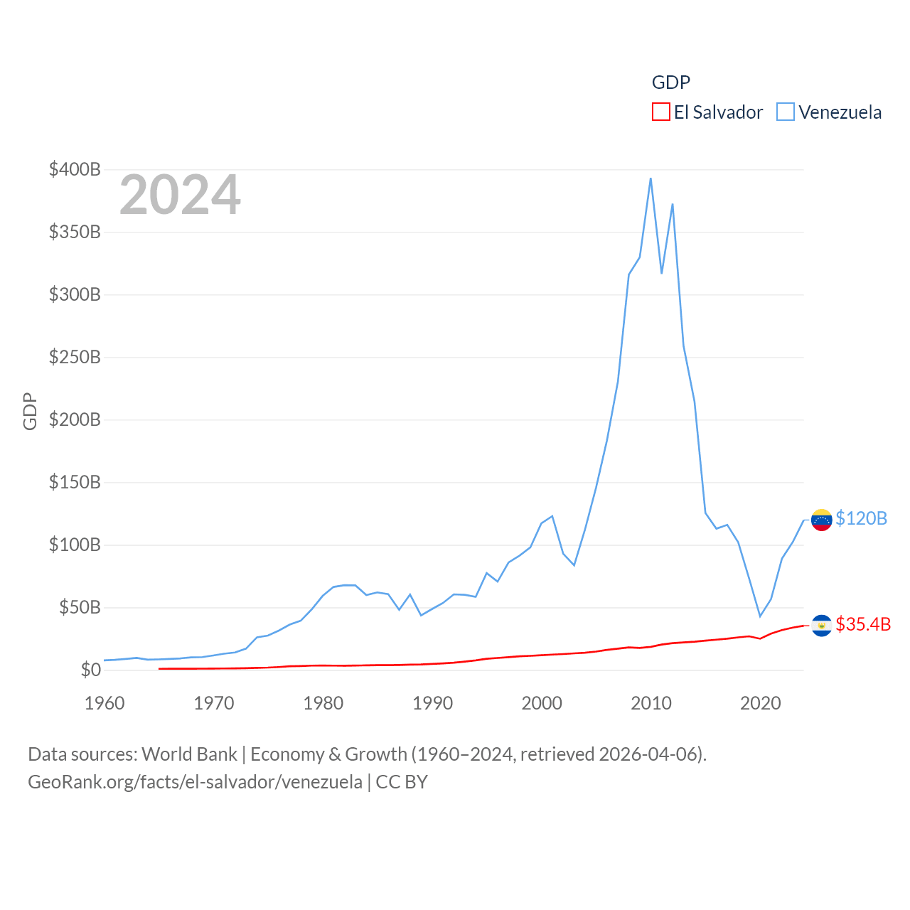 By GDP, El Salvador ranks 105/197 ($35.4B) and Venezuela ranks 65/197 ($120B). By GDP per capita, El Salvador ranks 116/197 ($5,580), while Venezuela ranks 128/197 ($4,218).