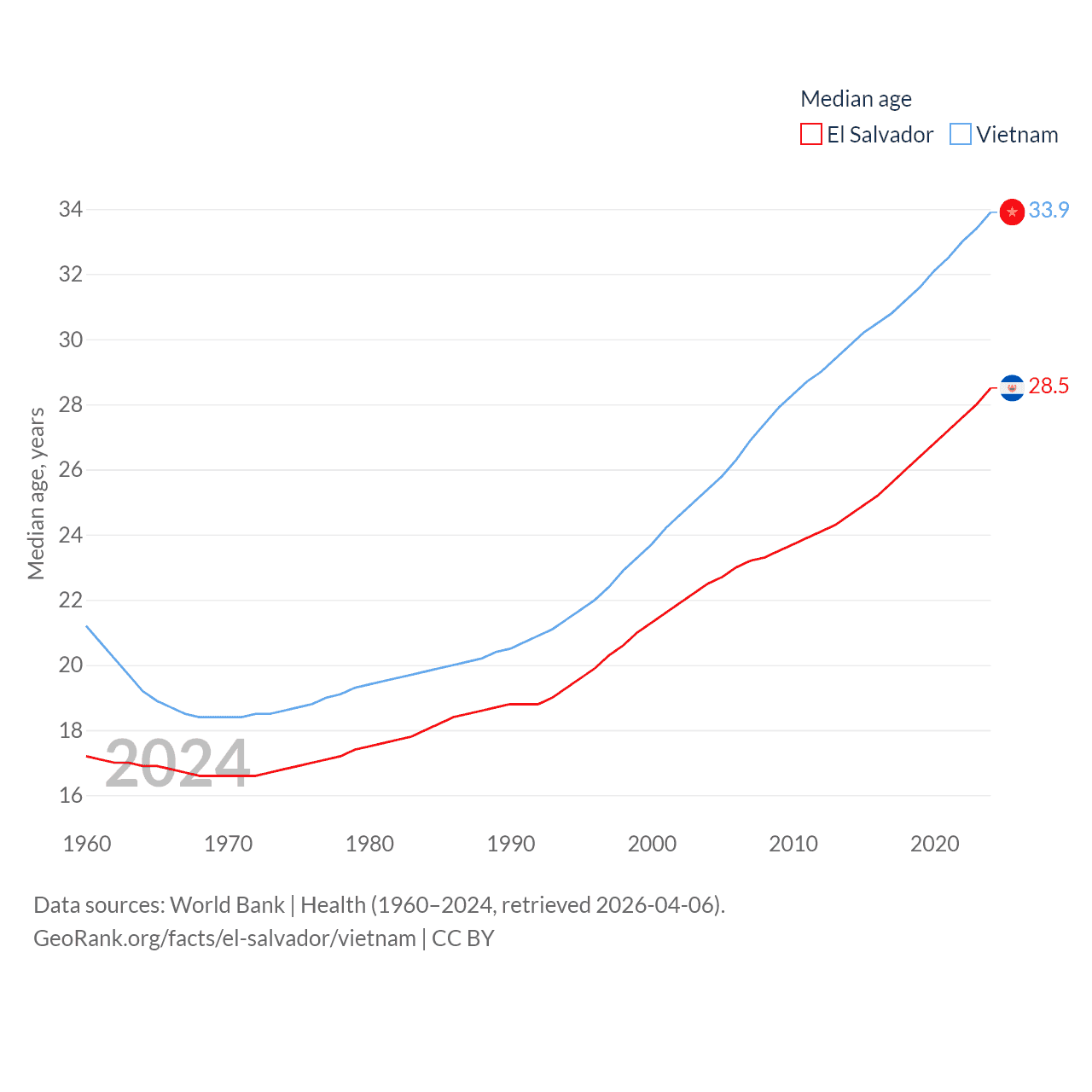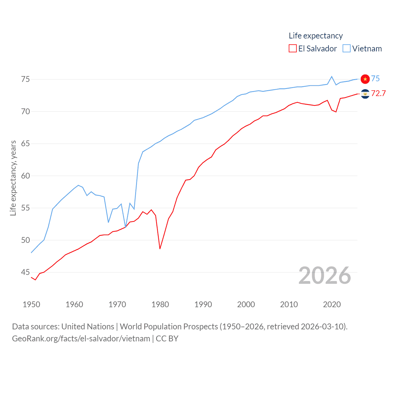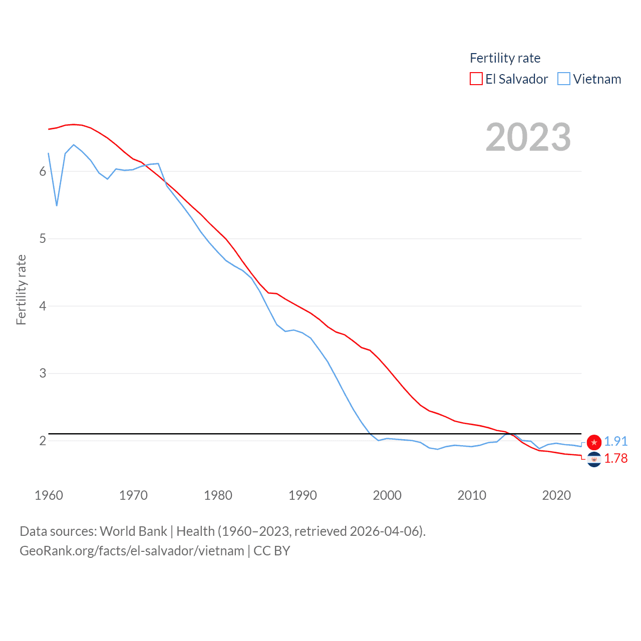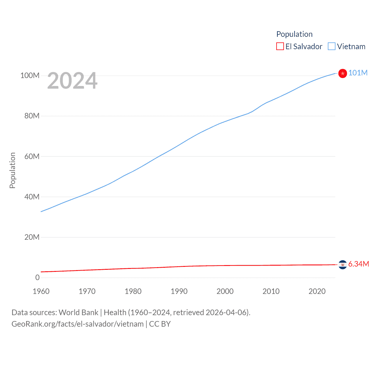 El Salvador has a population of 6.34M (ranked 111/197), compared with 101M in Vietnam (ranked 16/197). El Salvador's land area is 8,000 sq mi versus 121,016 sq mi for Vietnam (ranked 150th vs. 67th).