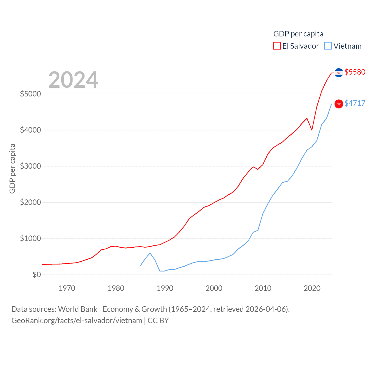 By GDP, El Salvador ranks 105/197 ($35.4B) and Vietnam ranks 33/197 ($476B). By GDP per capita, El Salvador ranks 116/197 ($5,580), while Vietnam ranks 122/197 ($4,717).