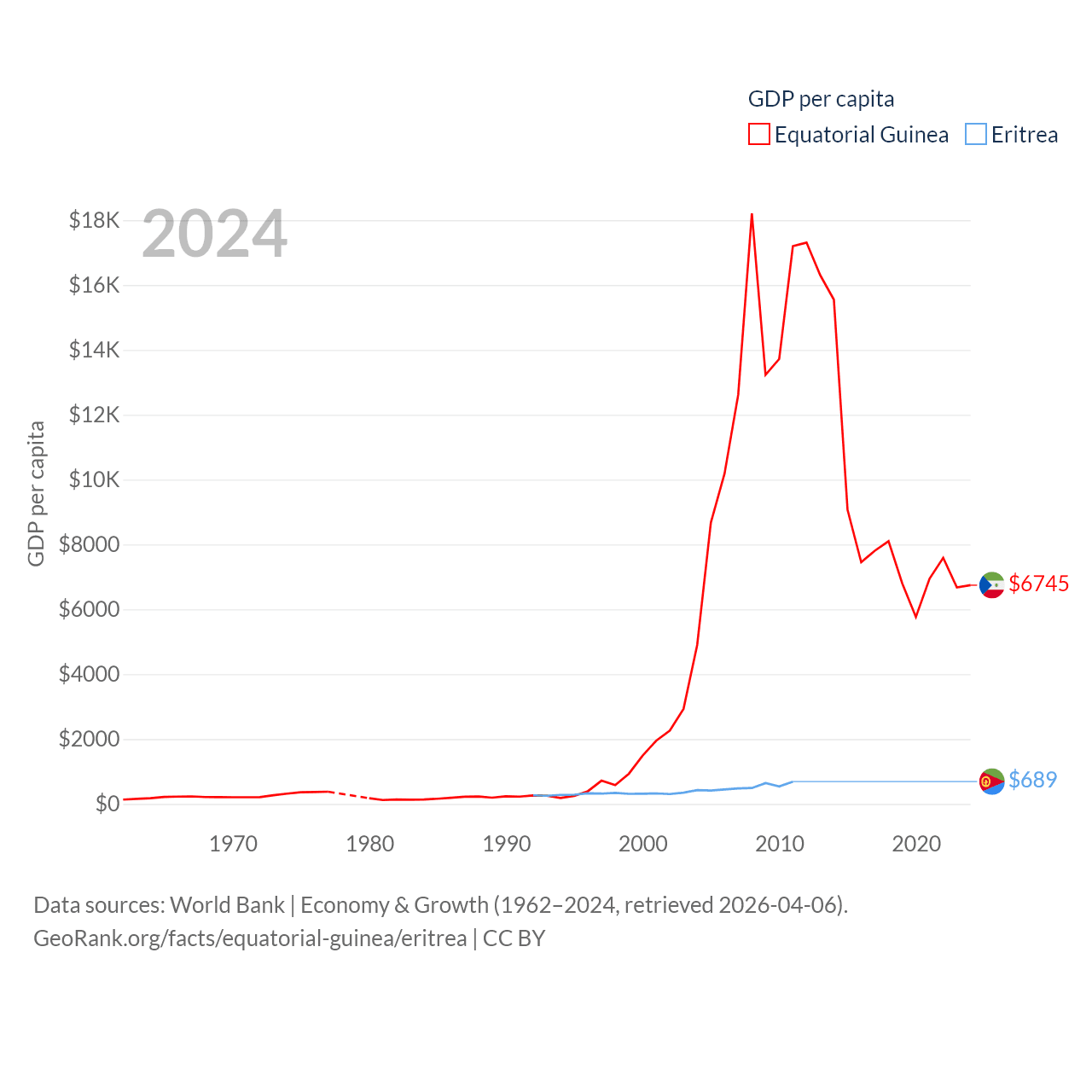 By GDP, Equatorial Guinea ranks 148/197 ($12.8B) and Eritrea ranks 179/197 ($2.07B). By GDP per capita, Equatorial Guinea ranks 106/197 ($6,745), while Eritrea ranks 188/197 ($689).