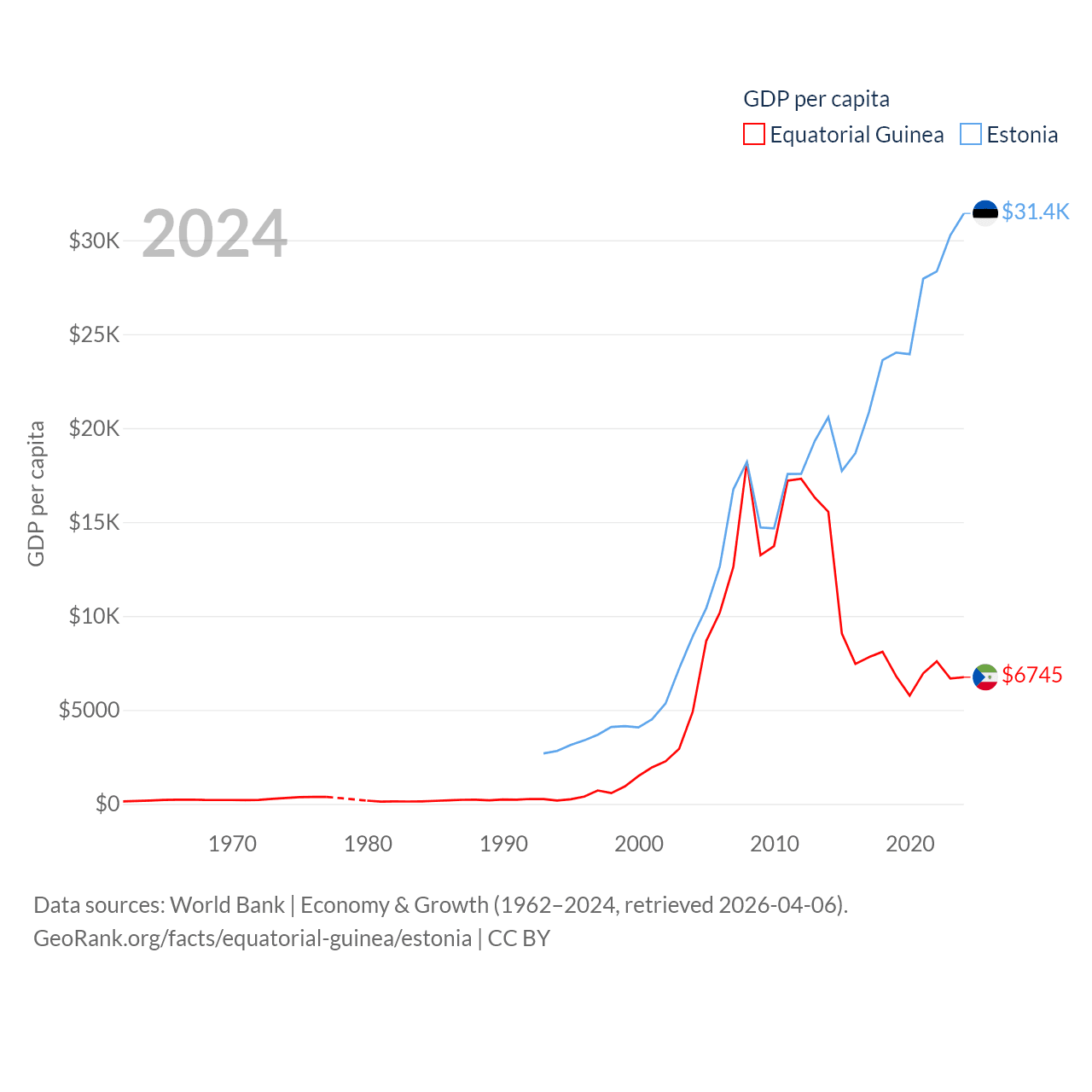 By GDP, Equatorial Guinea ranks 148/197 ($12.8B) and Estonia ranks 100/197 ($43.1B). By GDP per capita, Equatorial Guinea ranks 106/197 ($6,745), while Estonia ranks 40/197 ($31,428).