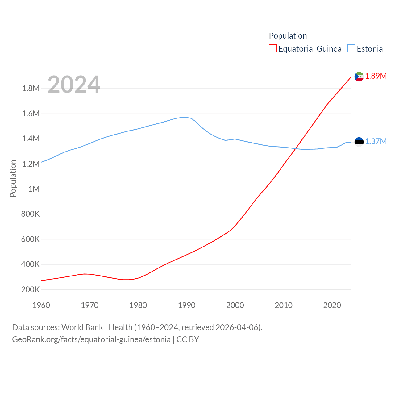 Equatorial Guinea has a population of 1.89M (ranked 148/197), compared with 1.37M in Estonia (ranked 153/197). Equatorial Guinea's land area is 10,830 sq mi versus 16,498 sq mi for Estonia (ranked 140th vs. 129th).