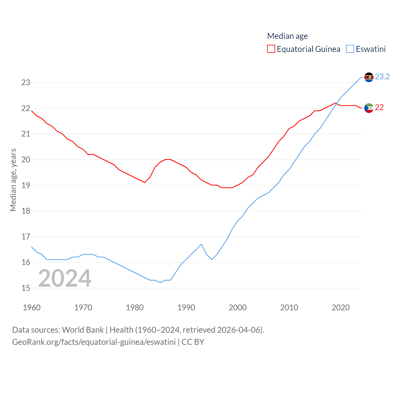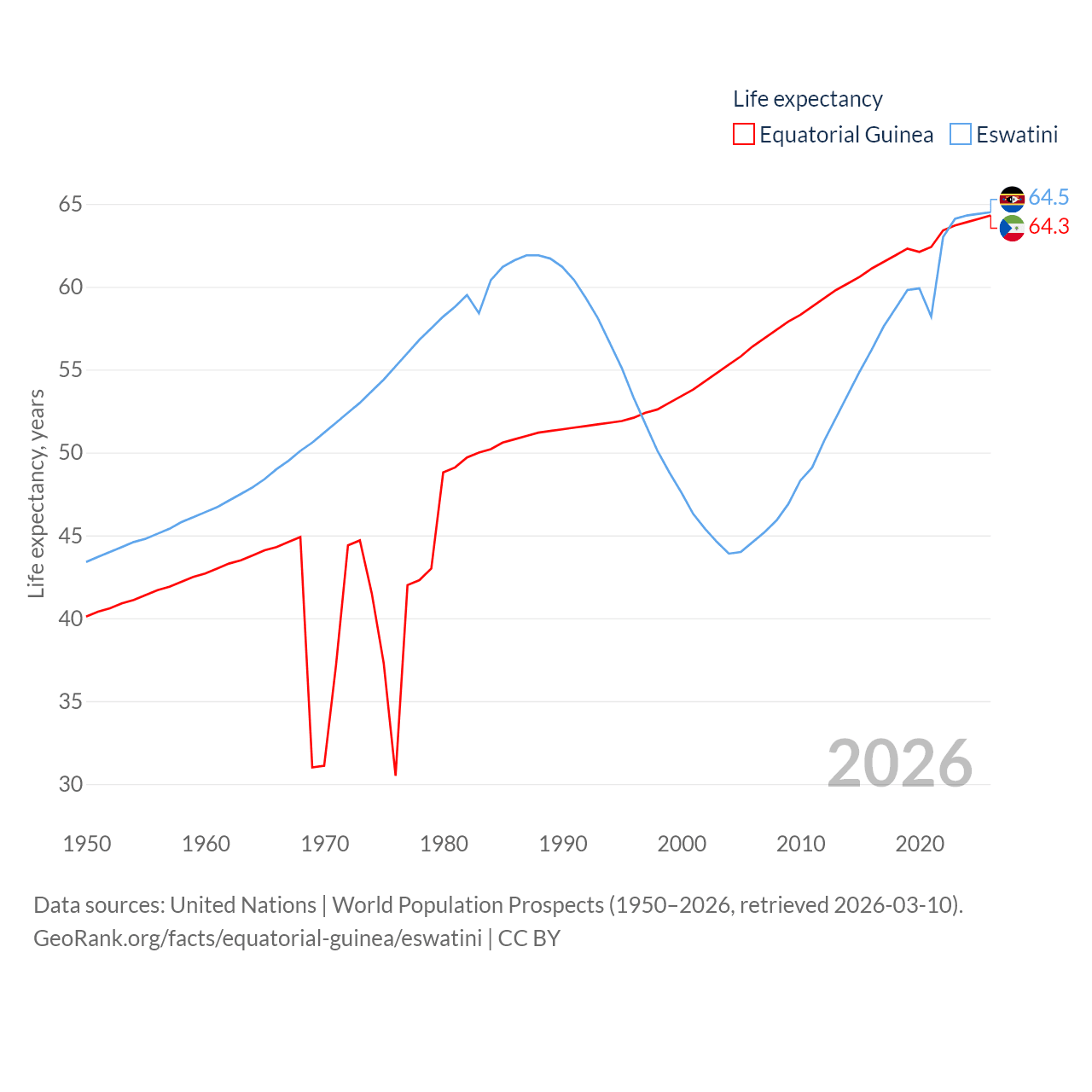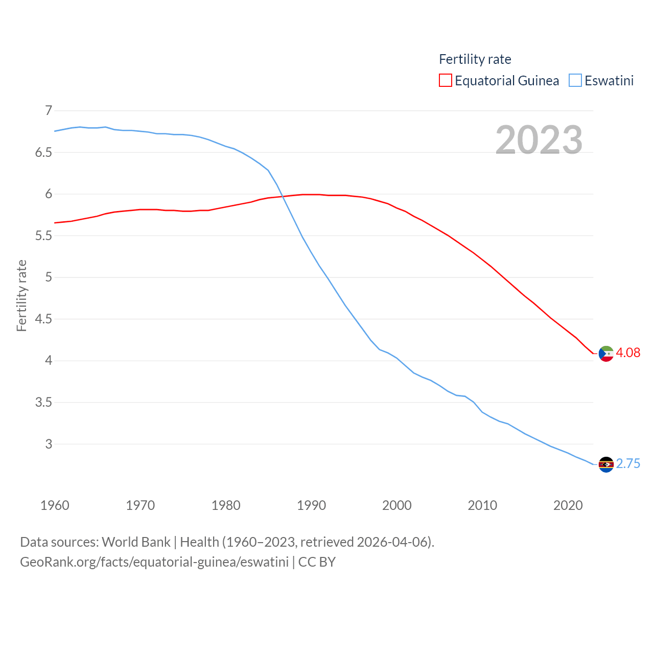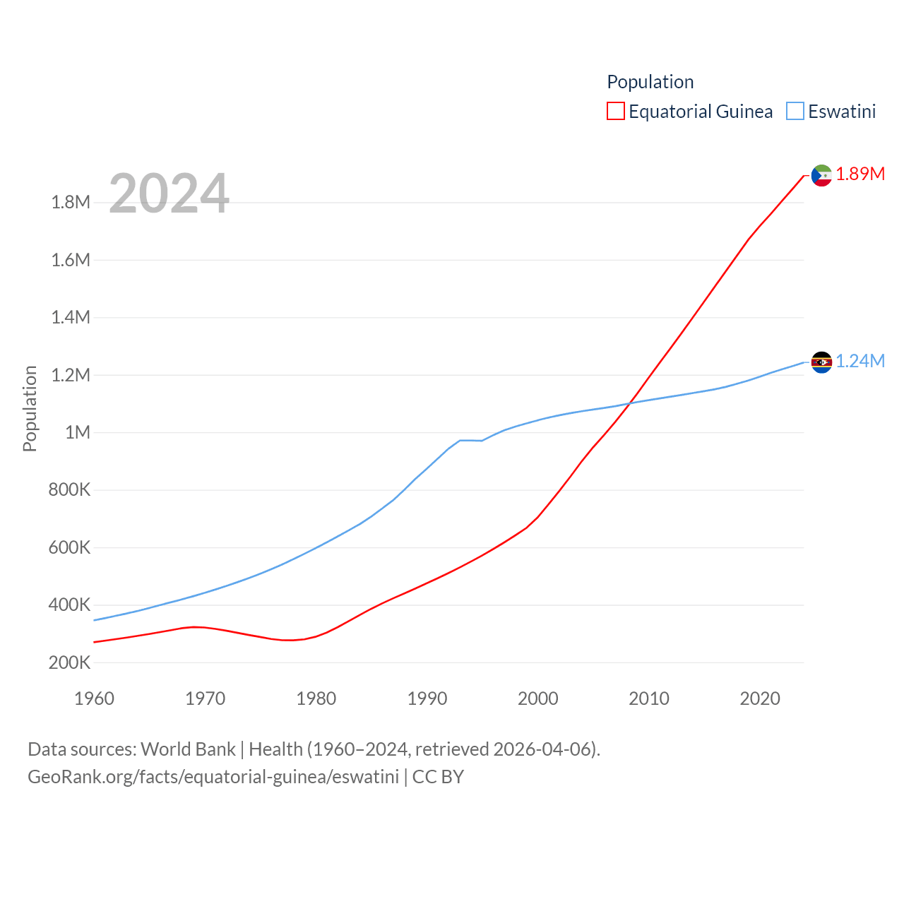 Equatorial Guinea has a population of 1.89M (ranked 148/197), compared with 1.24M in Eswatini (ranked 157/197). Equatorial Guinea's land area is 10,830 sq mi versus 6,641 sq mi for Eswatini (ranked 140th vs. 154th).