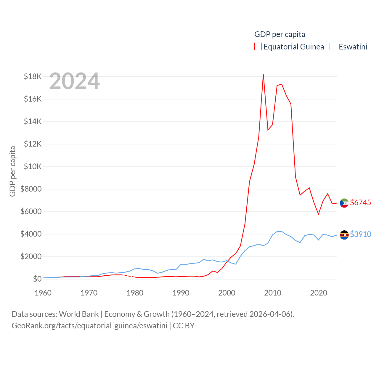 By GDP, Equatorial Guinea ranks 148/197 ($12.8B) and Eswatini ranks 162/197 ($4.86B). By GDP per capita, Equatorial Guinea ranks 106/197 ($6,745), while Eswatini ranks 131/197 ($3,910).