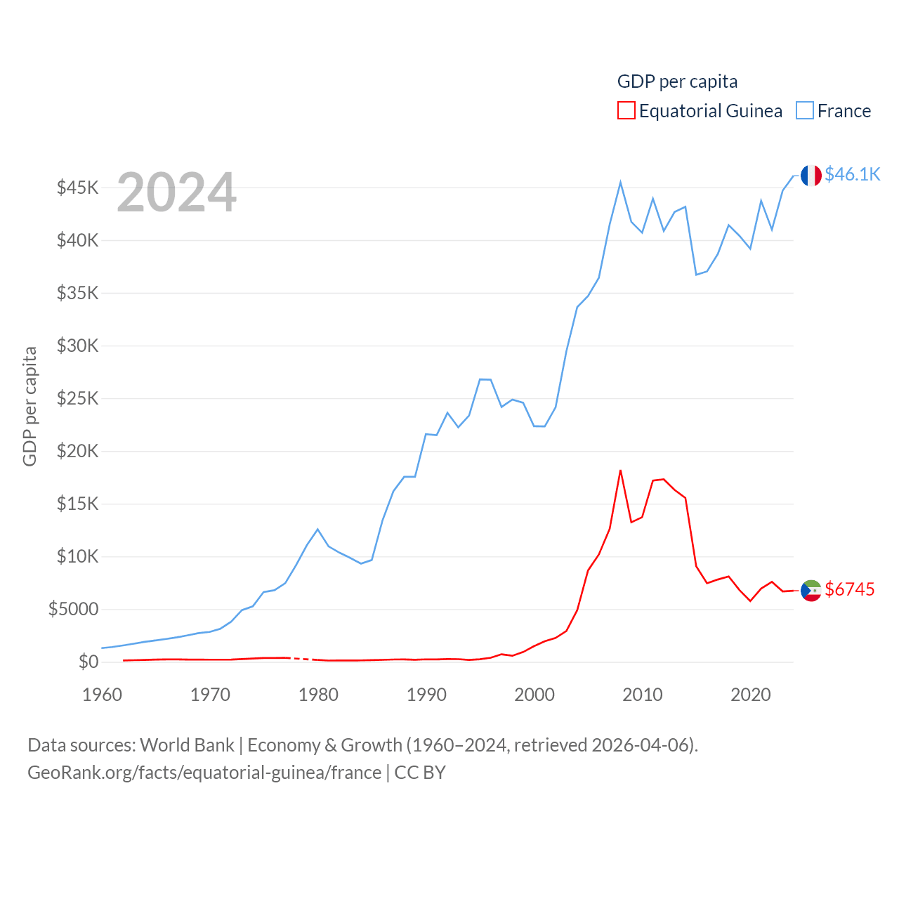By GDP, Equatorial Guinea ranks 148/197 ($12.8B) and France ranks 7/197 ($3.16T). By GDP per capita, Equatorial Guinea ranks 106/197 ($6,745), while France ranks 27/197 ($46,103).