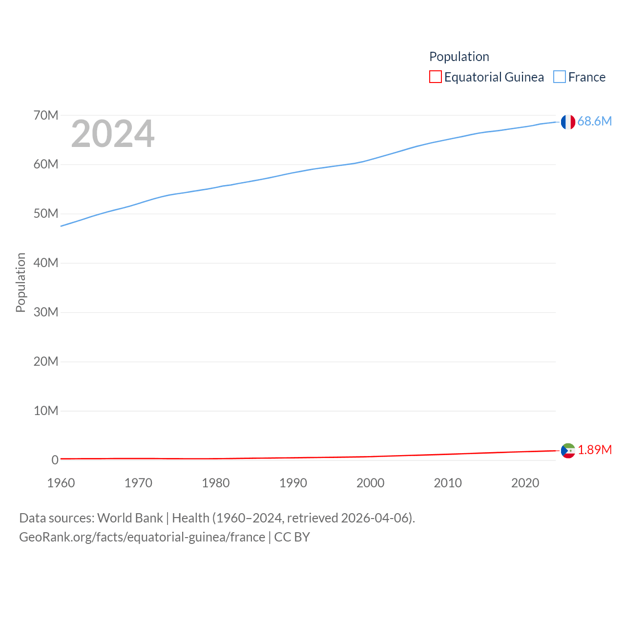Equatorial Guinea has a population of 1.89M (ranked 148/197), compared with 68.6M in France (ranked 23/197). Equatorial Guinea's land area is 10,830 sq mi versus 208,090 sq mi for France (ranked 140th vs. 48th).