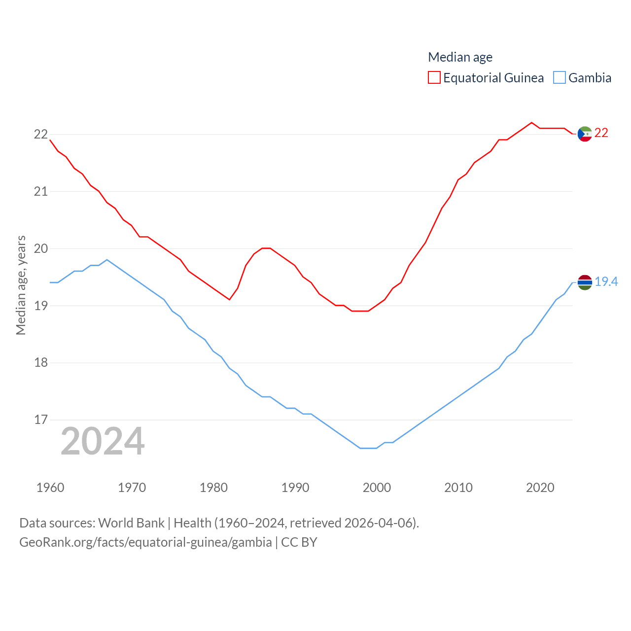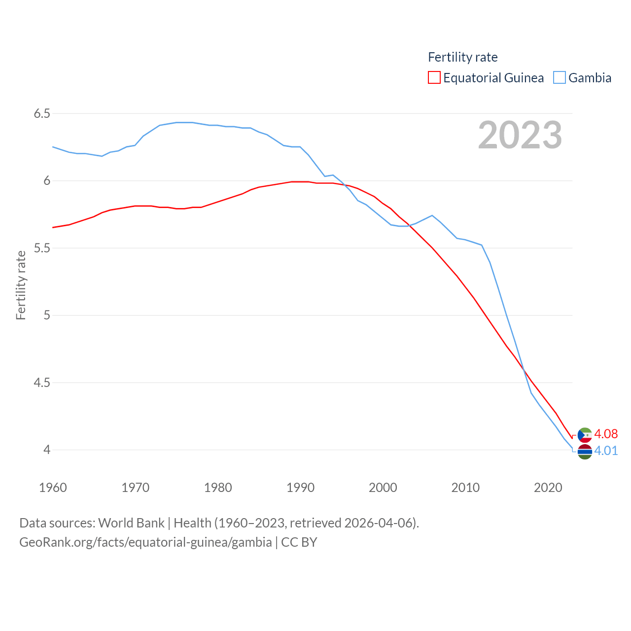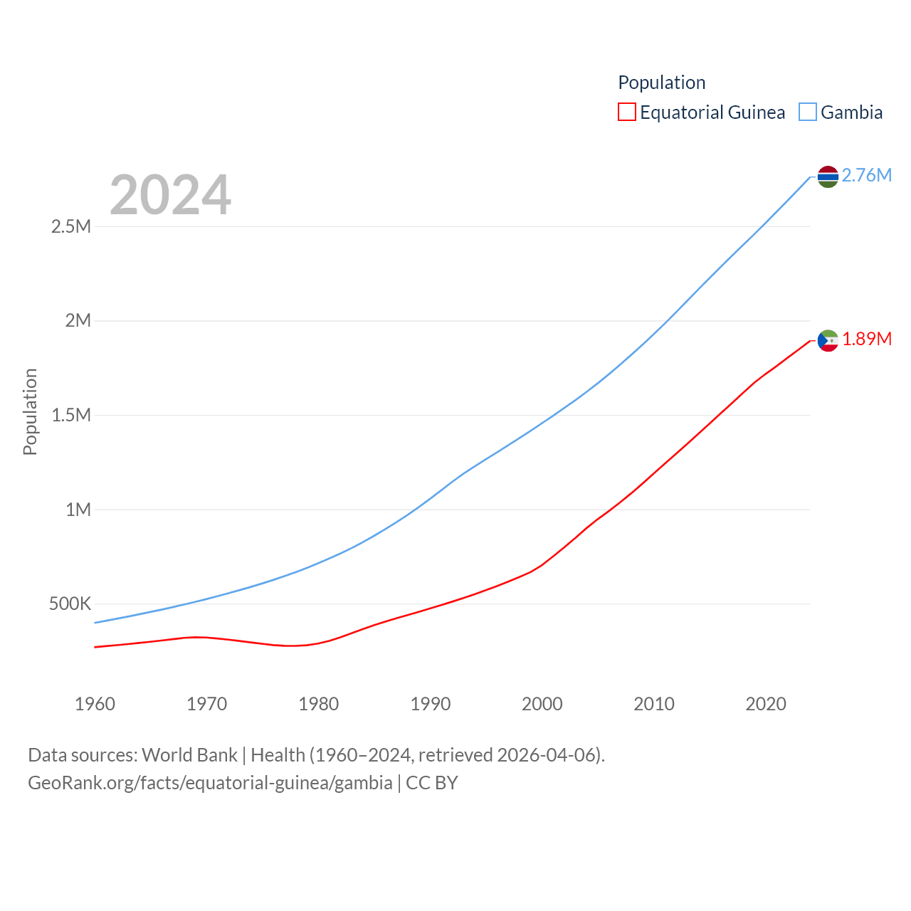 Equatorial Guinea has a population of 1.89M (ranked 148/197), compared with 2.76M in The Gambia (ranked 140/197). Equatorial Guinea's land area is 10,830 sq mi versus 3,907 sq mi for The Gambia (ranked 140th vs. 161st).