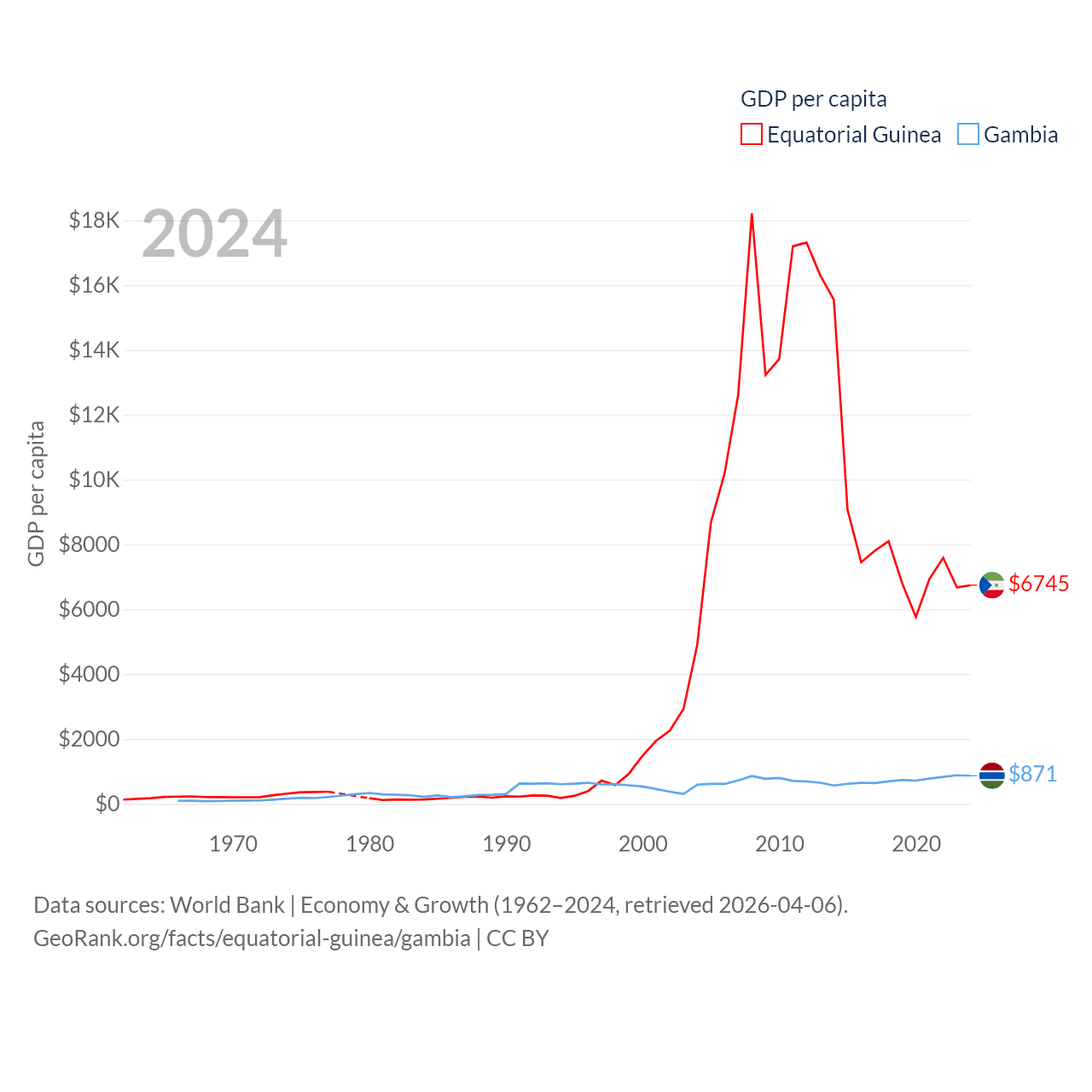 By GDP, Equatorial Guinea ranks 148/197 ($12.8B) and The Gambia ranks 174/197 ($2.4B). By GDP per capita, Equatorial Guinea ranks 106/197 ($6,745), while The Gambia ranks 183/197 ($871).