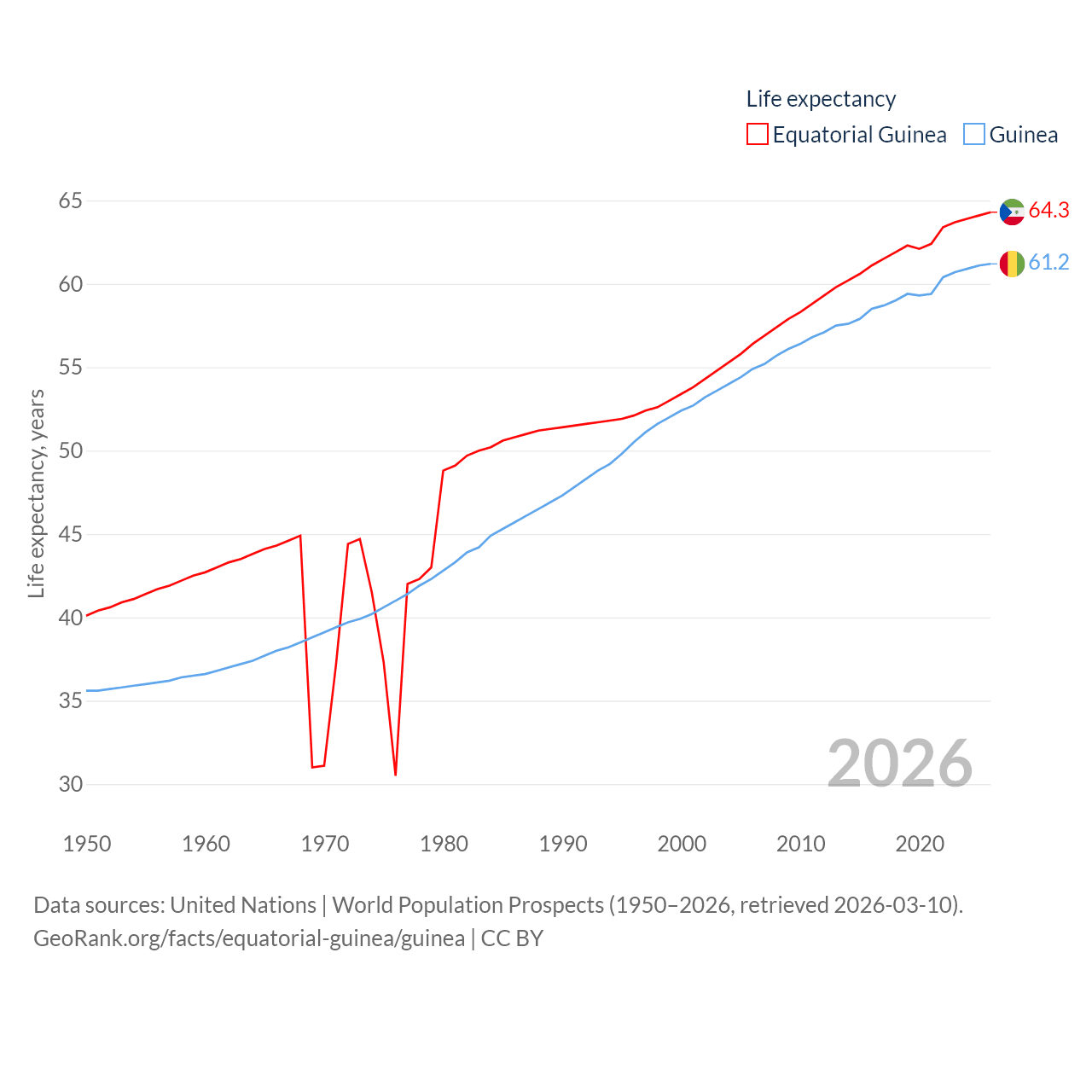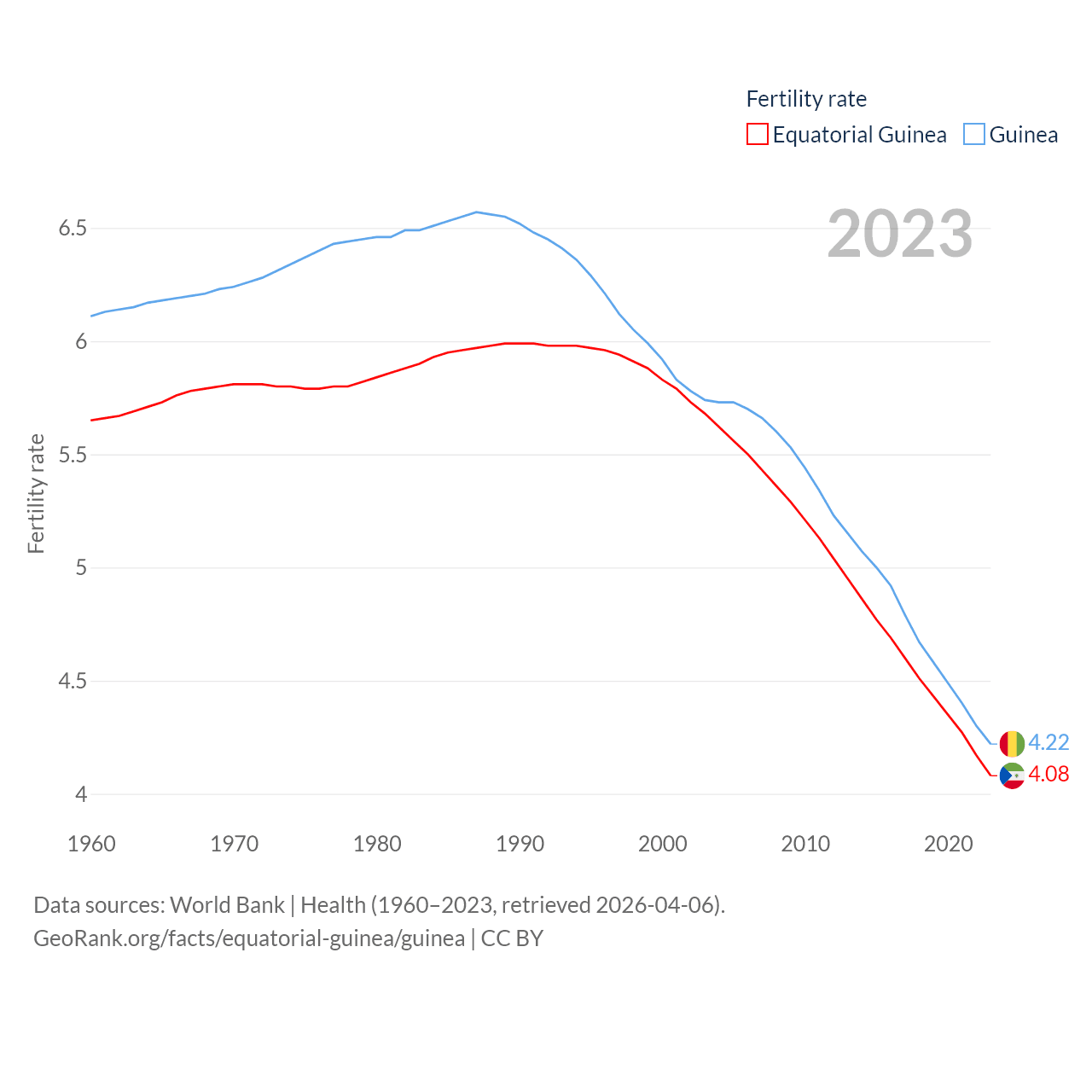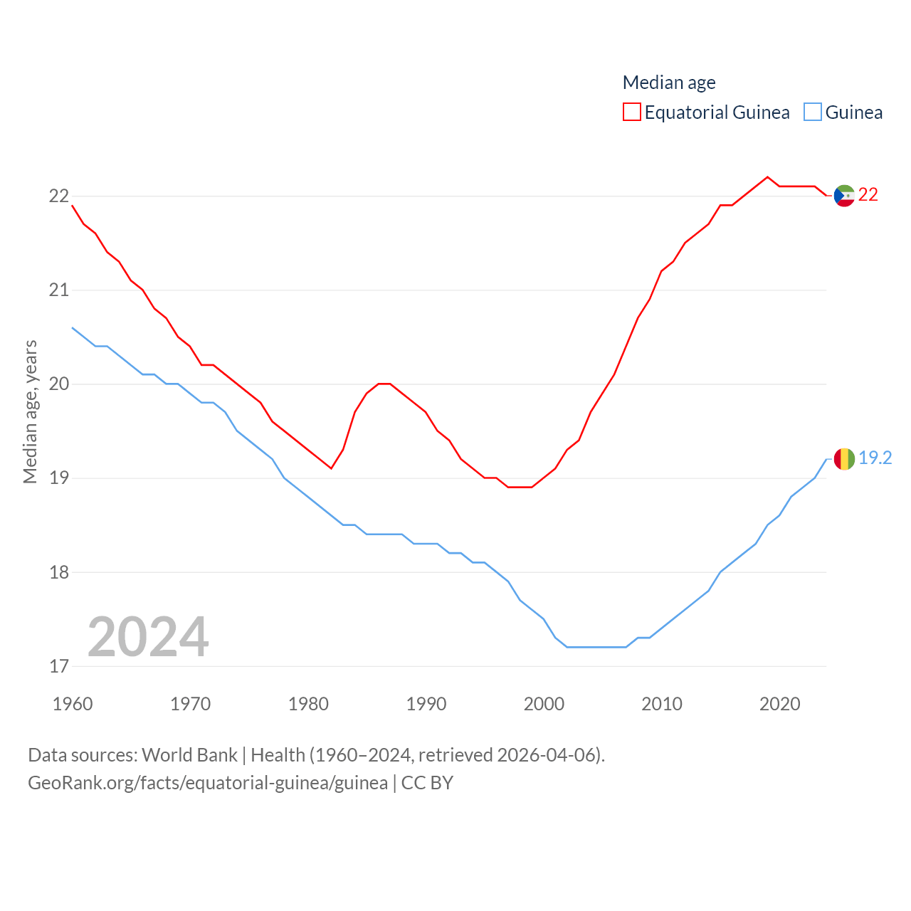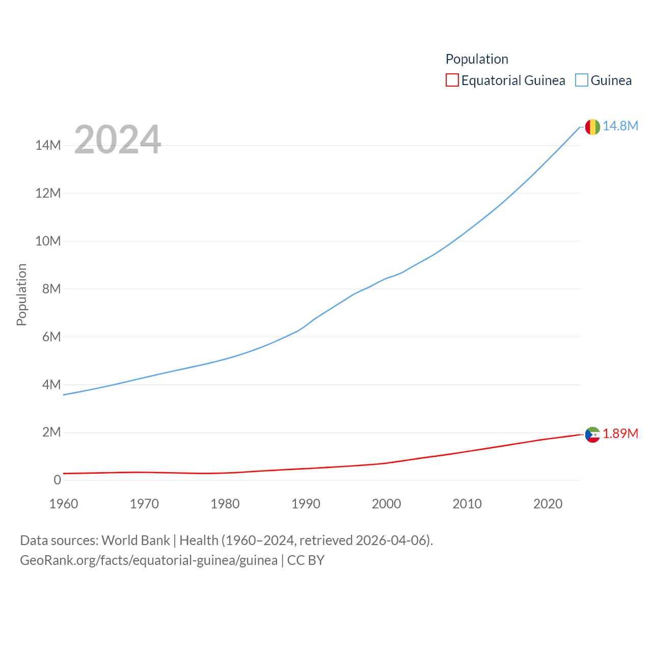 Equatorial Guinea has a population of 1.89M (ranked 148/197), compared with 14.8M in Guinea (ranked 75/197). Equatorial Guinea's land area is 10,830 sq mi versus 94,873 sq mi for Guinea (ranked 140th vs. 77th).