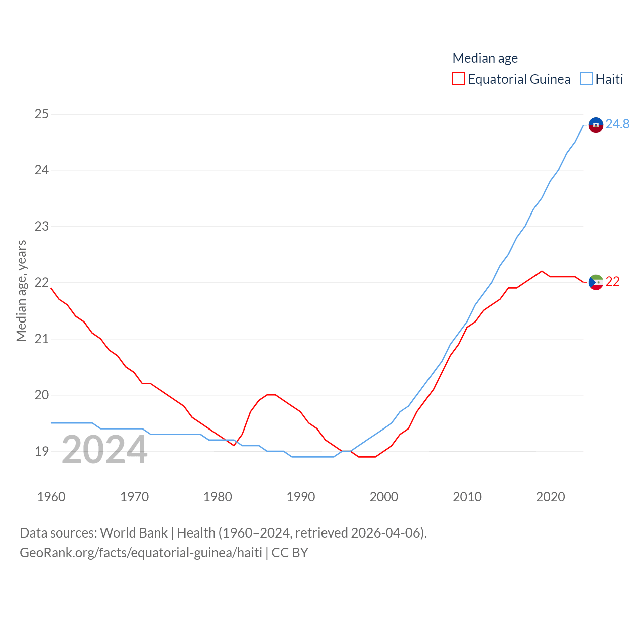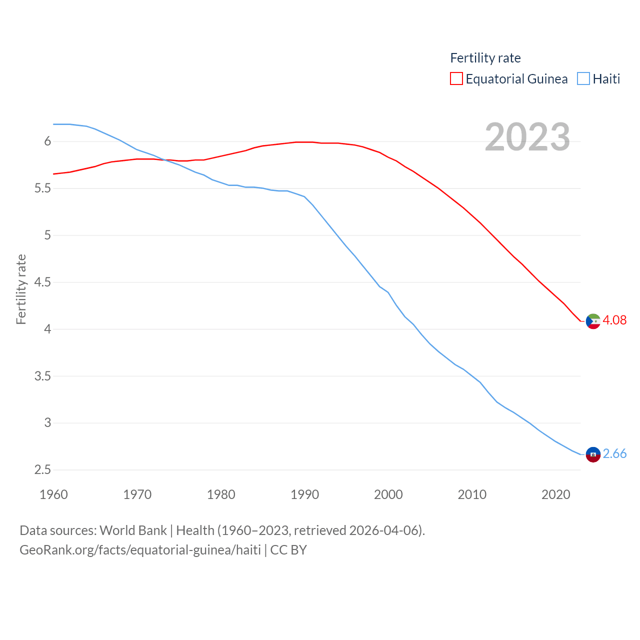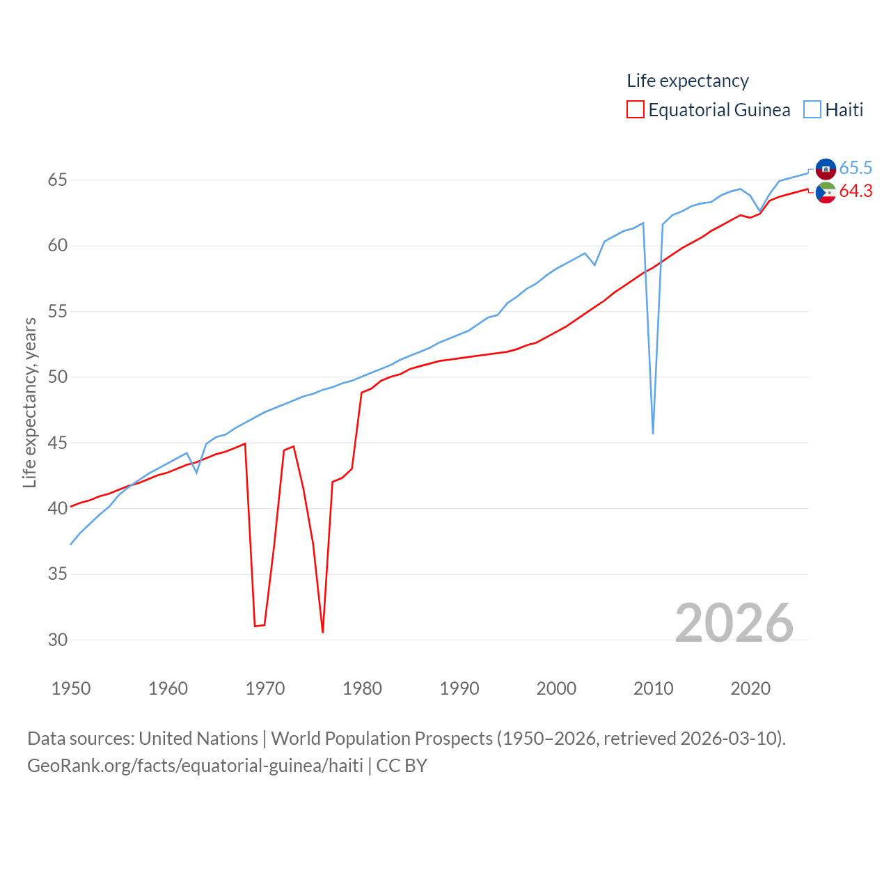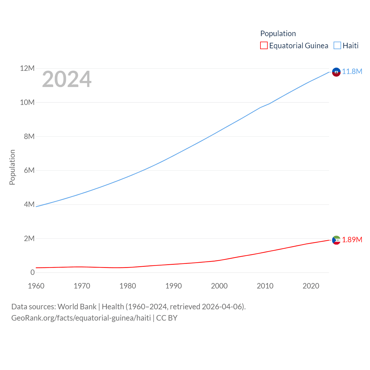 Equatorial Guinea has a population of 1.89M (ranked 148/197), compared with 11.8M in Haiti (ranked 83/197). Equatorial Guinea's land area is 10,830 sq mi versus 10,641 sq mi for Haiti (ranked 140th vs. 142nd).