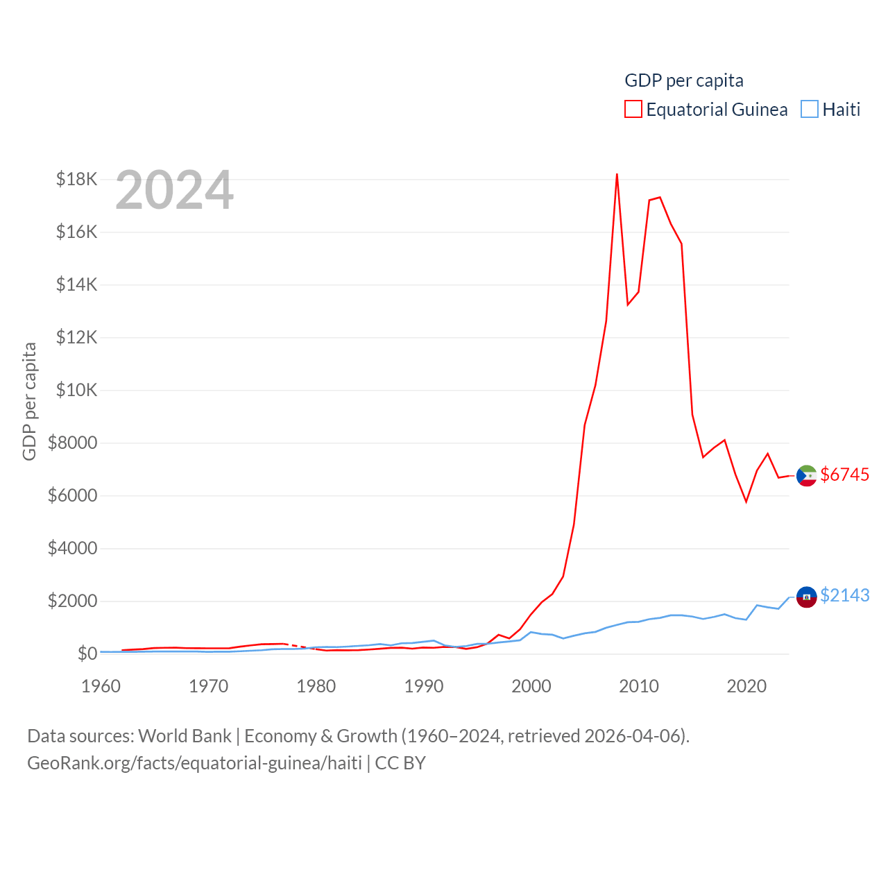 By GDP, Equatorial Guinea ranks 148/197 ($12.8B) and Haiti ranks 117/197 ($25.2B). By GDP per capita, Equatorial Guinea ranks 106/197 ($6,745), while Haiti ranks 153/197 ($2,143).