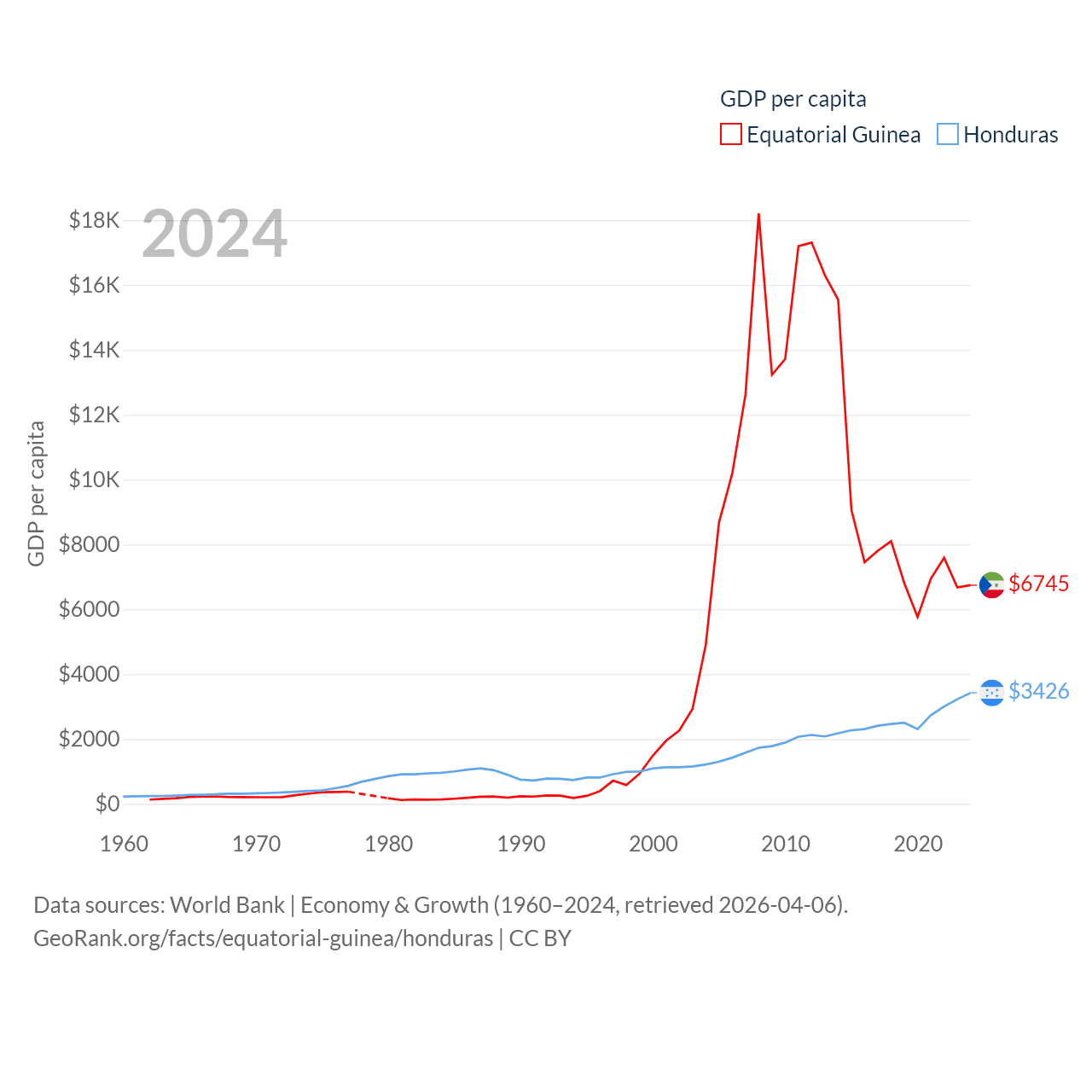 By GDP, Equatorial Guinea ranks 148/197 ($12.8B) and Honduras ranks 104/197 ($37.1B). By GDP per capita, Equatorial Guinea ranks 106/197 ($6,745), while Honduras ranks 136/197 ($3,426).