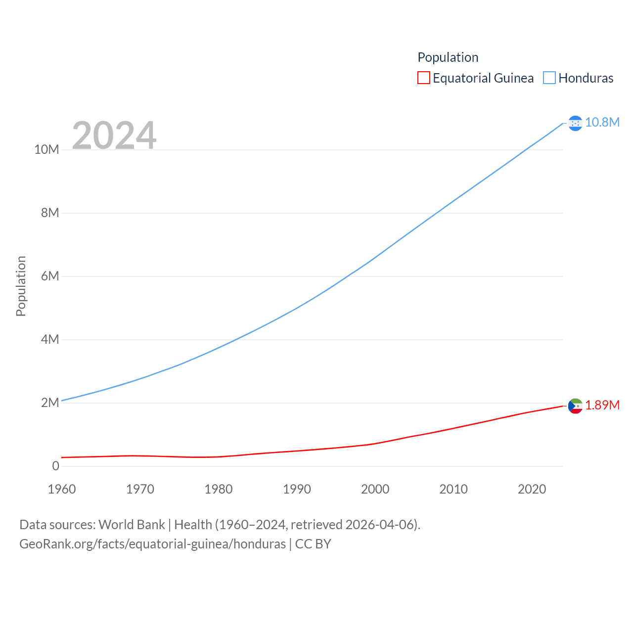 Equatorial Guinea has a population of 1.89M (ranked 148/197), compared with 10.8M in Honduras (ranked 89/197). Equatorial Guinea's land area is 10,830 sq mi versus 43,201 sq mi for Honduras (ranked 140th vs. 100th).